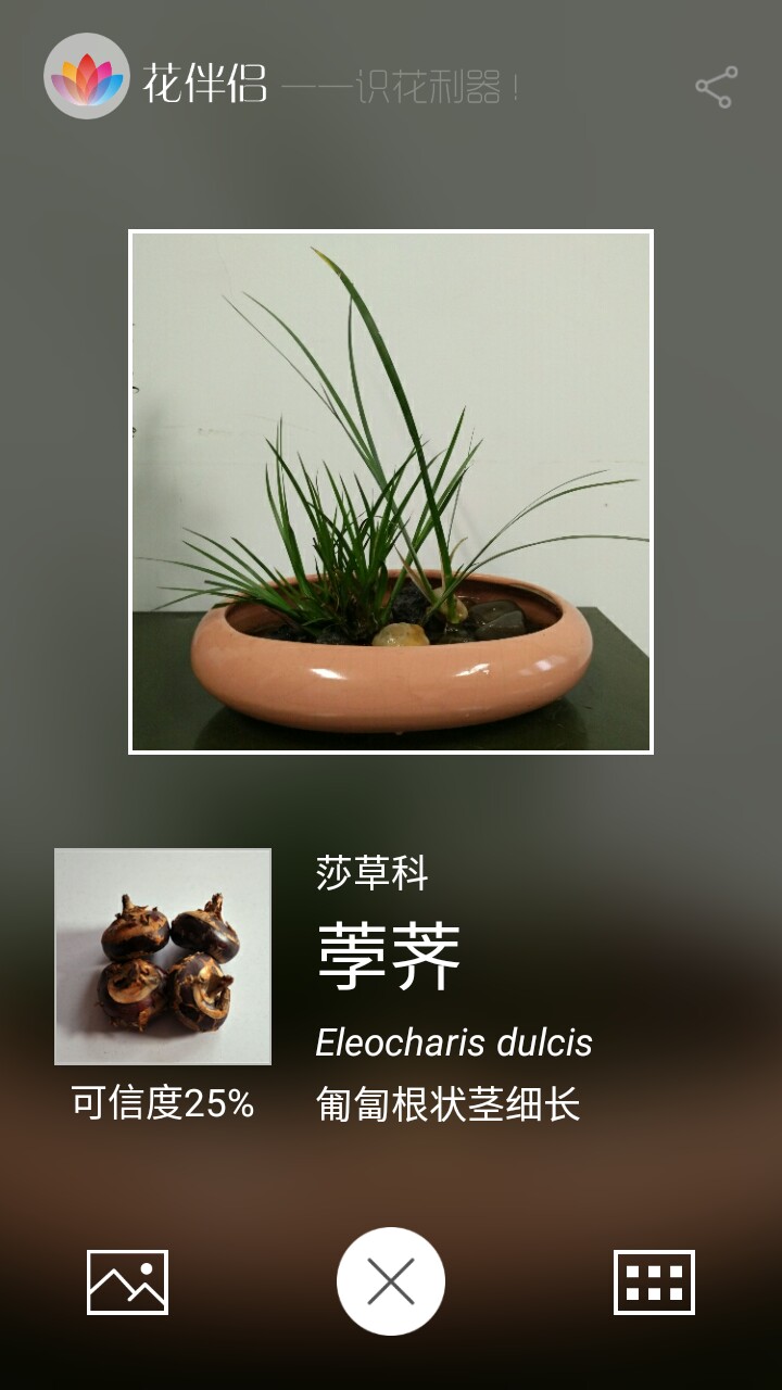 第二回是下了一个“花伴侣”,还是用石菖蒲测试,神奇的事情发生了,它说这是“荸荠”!再用其他的花草照片测试,测试结果也基本属于游方郎中的水平,算了,这里就不多攻击“形色”同行了,做人还是要厚道。