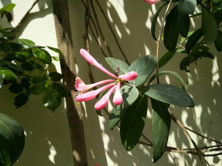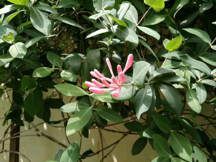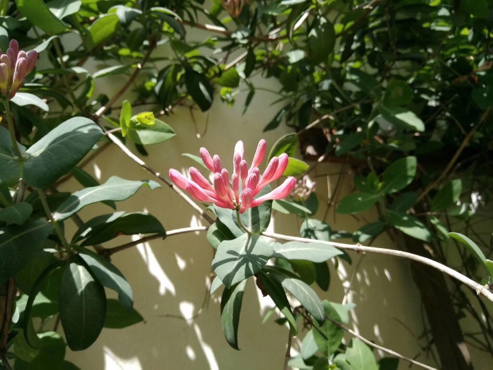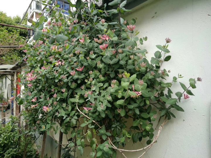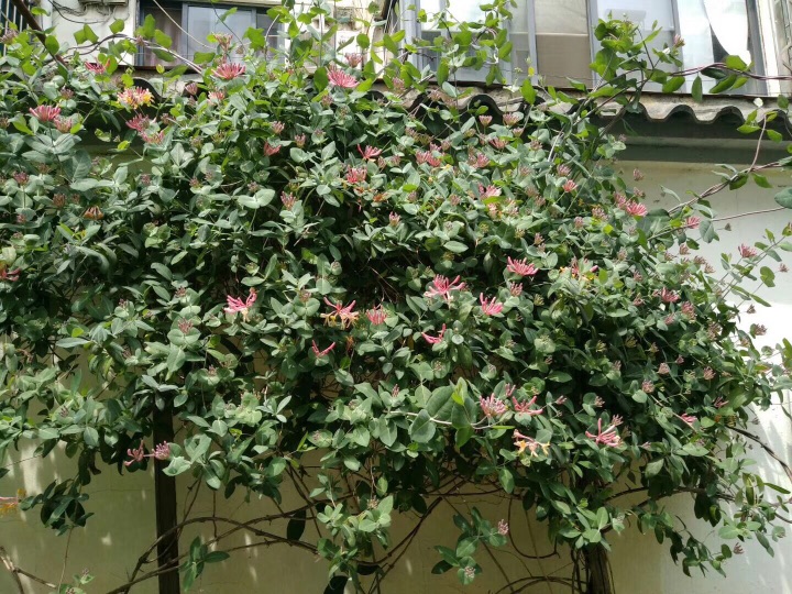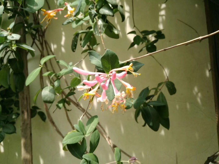 金银花,三月开花,五出,微香,蒂带红色,花初开则色白,经一、二日则色黄,故名金银花。又因为一蒂二花,两条花蕊探在外,成双成对,形影不离,状如雄雌相伴,又似鸳鸯对舞,故有鸳鸯藤之称。