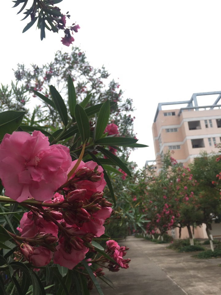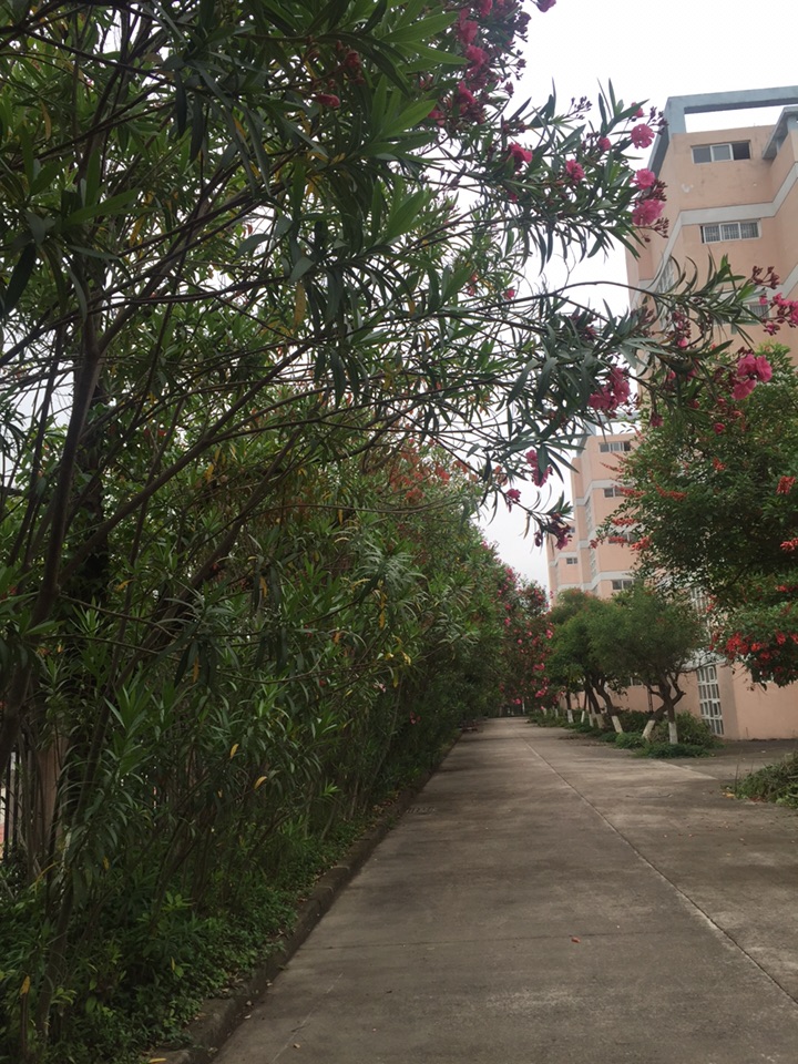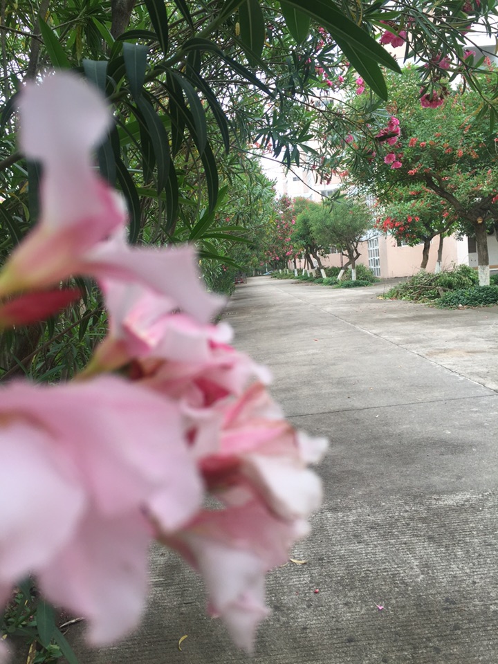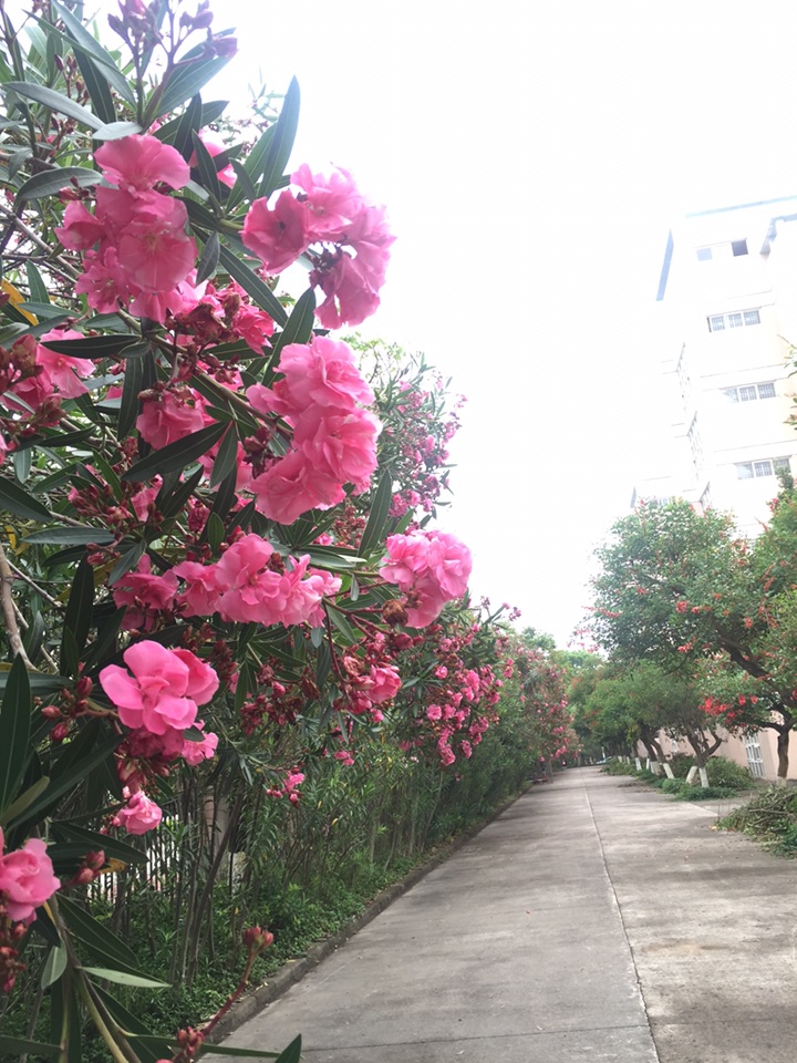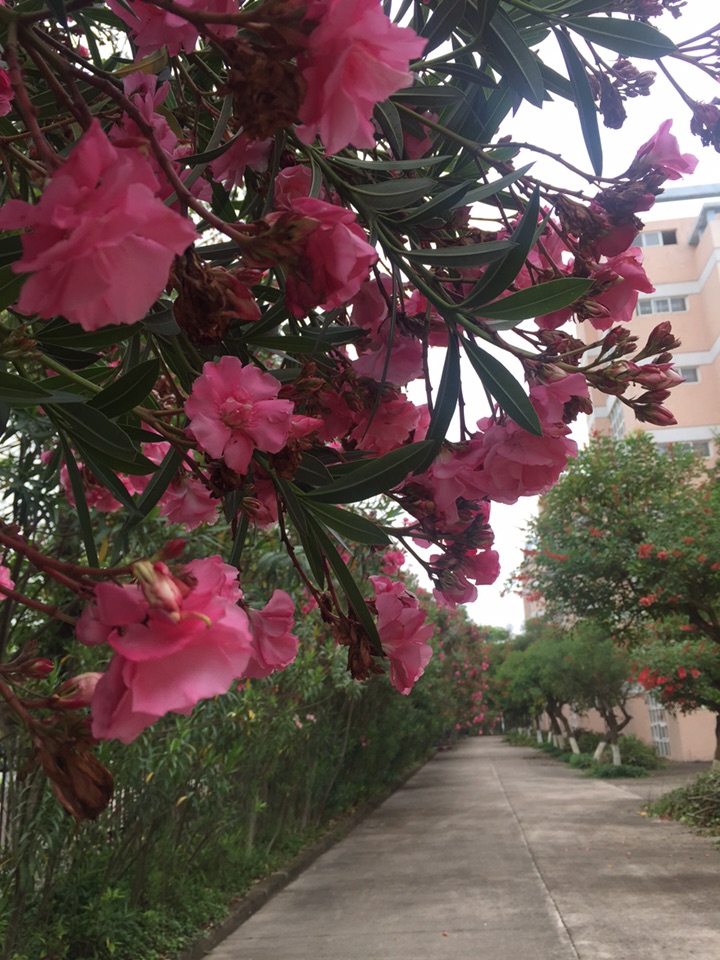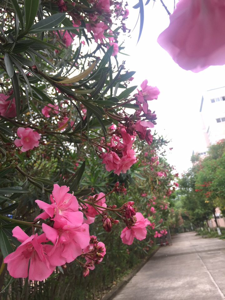 这是一条幽僻的小径,平时很少人走。靠近宿舍那边种植有刺桐,而靠近围墙边是一排的夹竹桃,在春风里盛开着:鲜艳、甜美、热烈,丝毫不因地处偏僻而逊色。