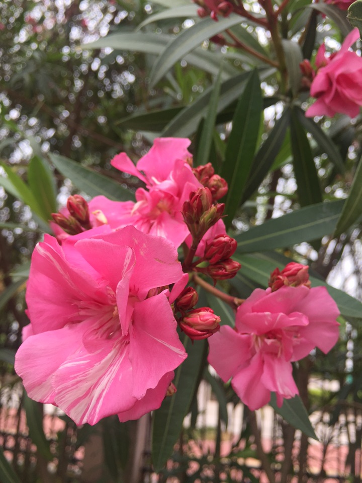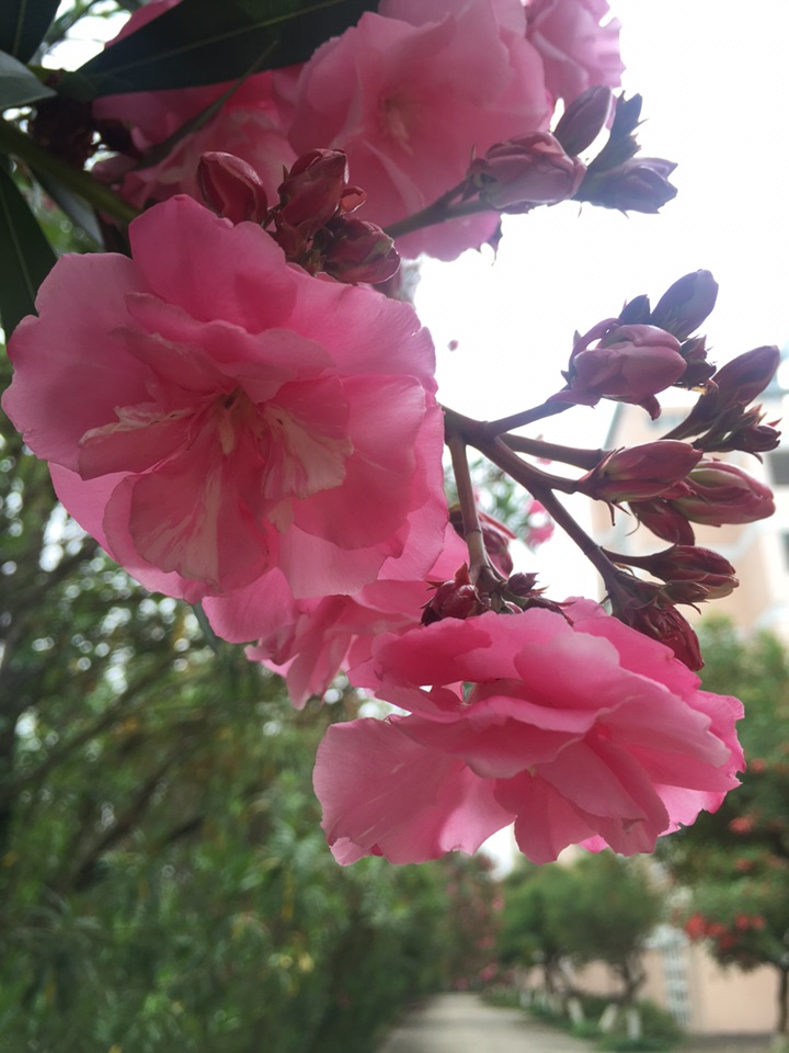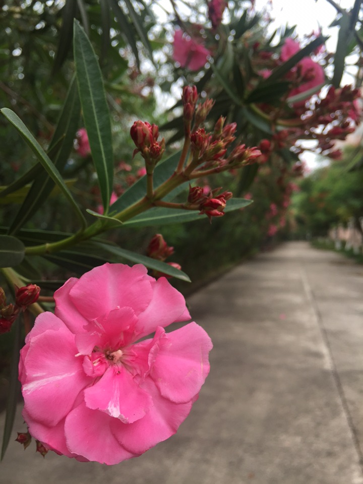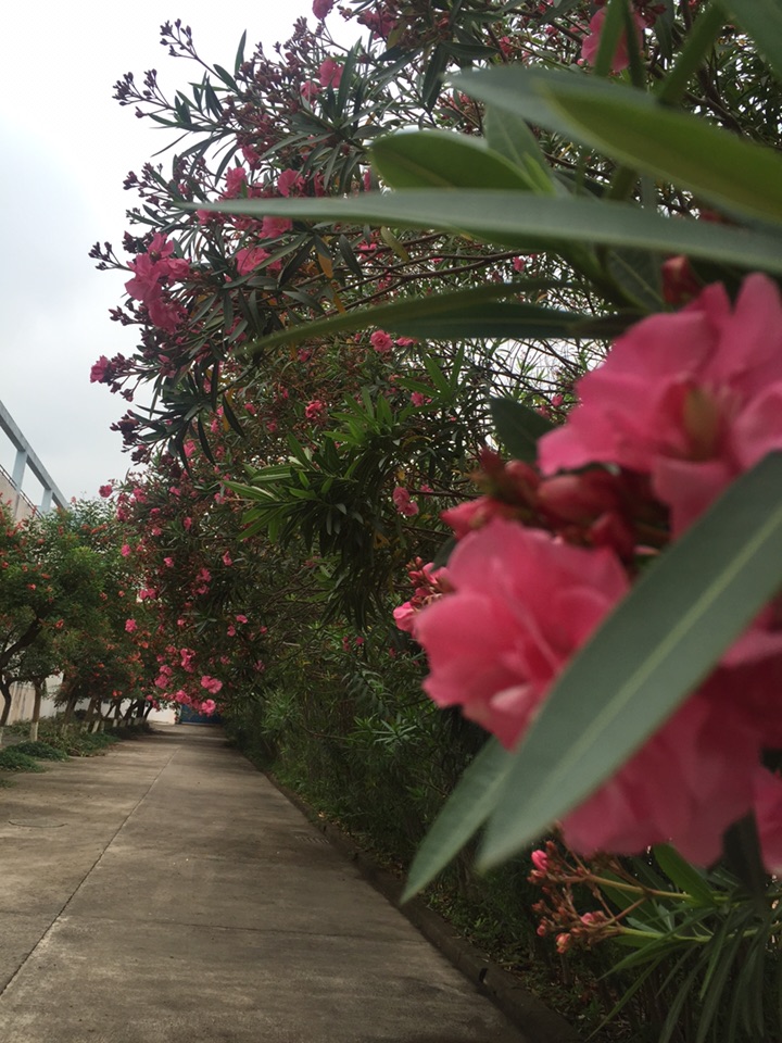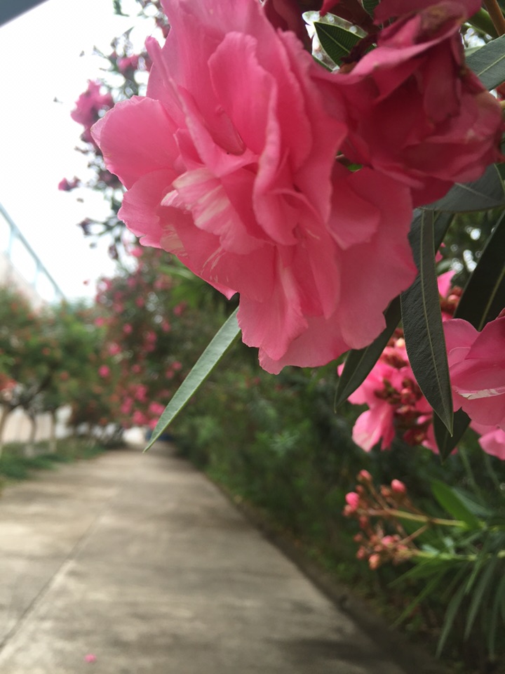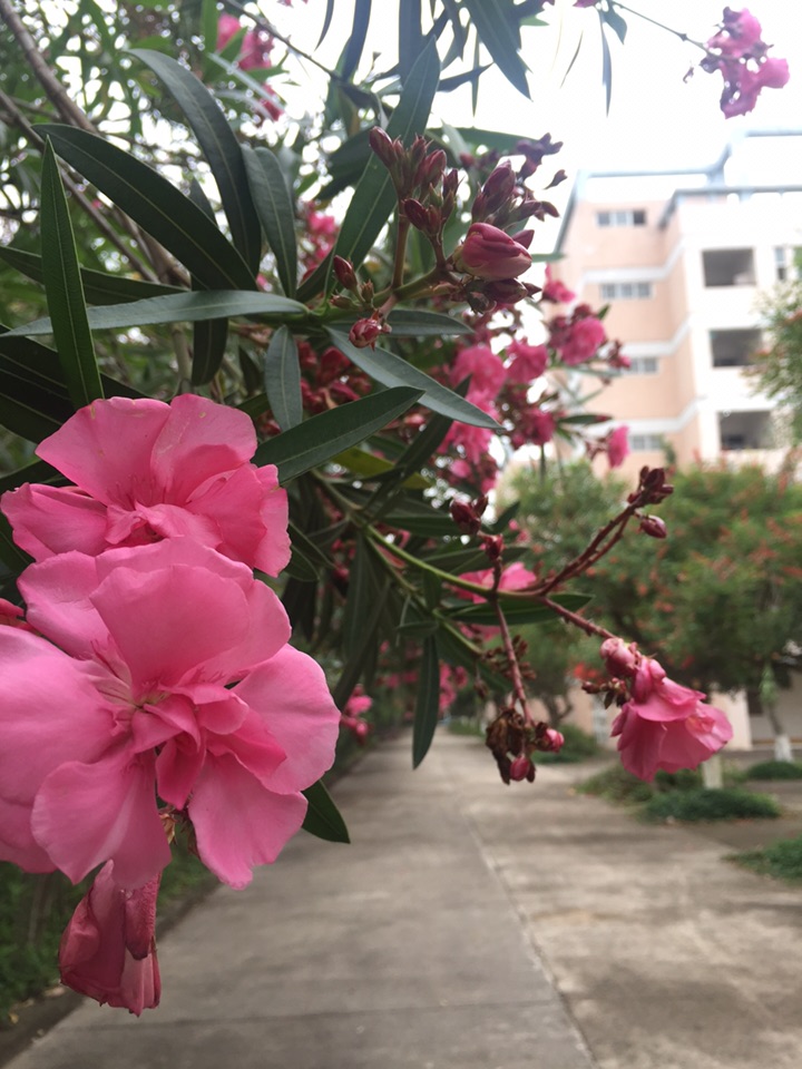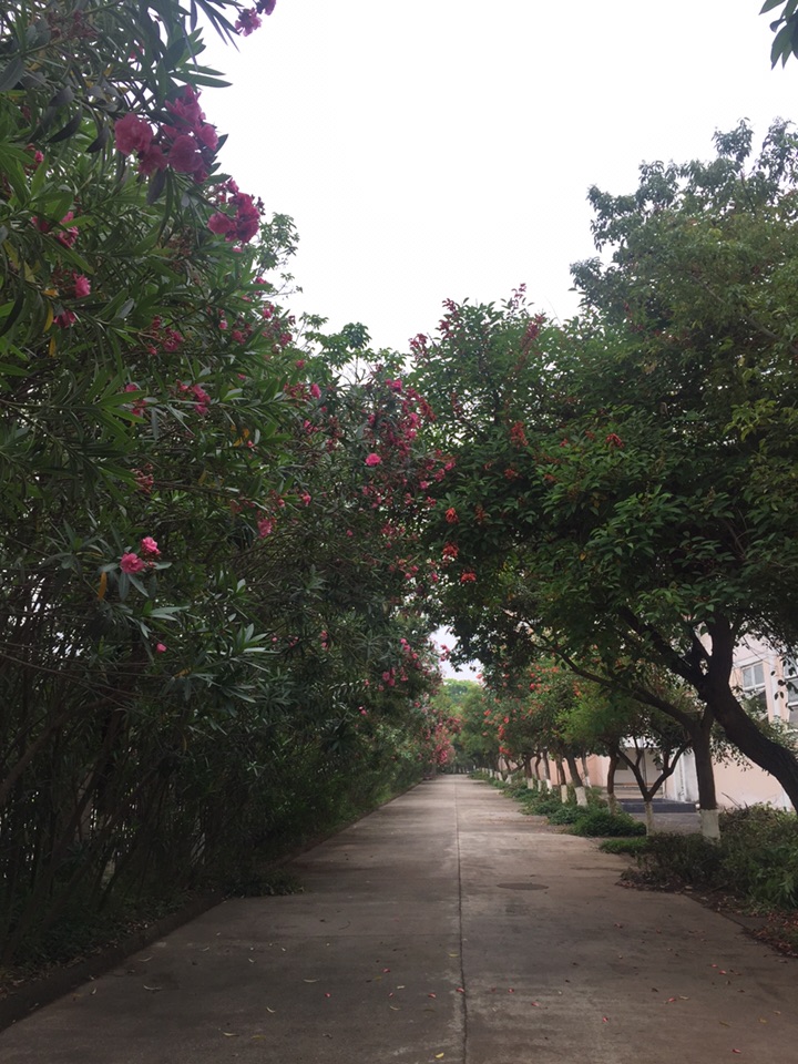 这是一条幽僻的小径,平时很少人走。靠近宿舍那边种植有刺桐,而靠近围墙边是一排的夹竹桃,在春风里盛开着:鲜艳、甜美、热烈,丝毫不因地处偏僻而逊色。