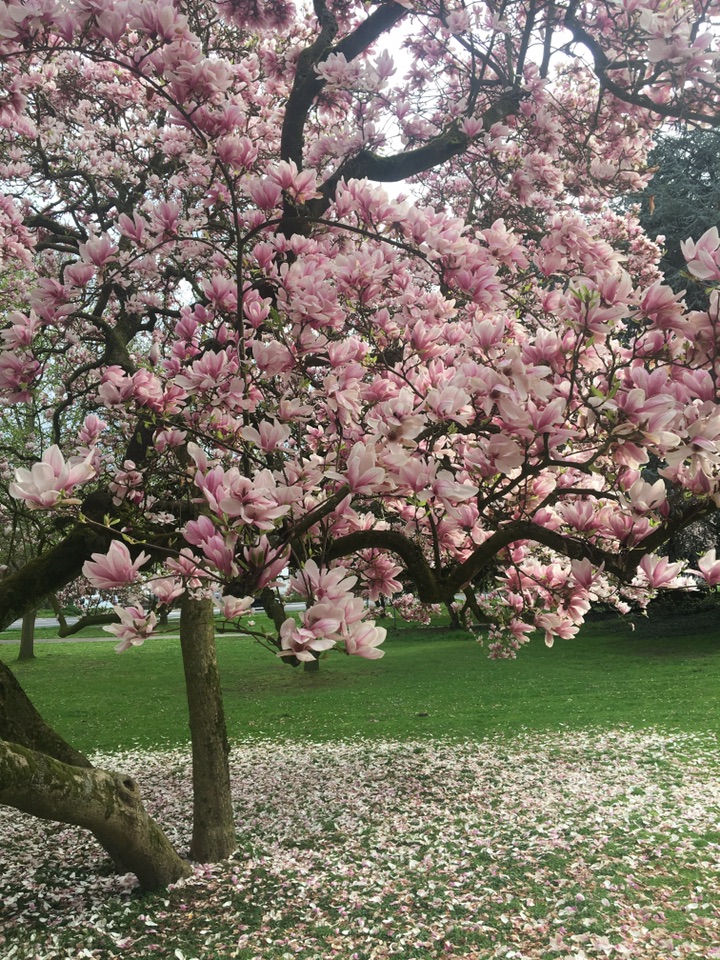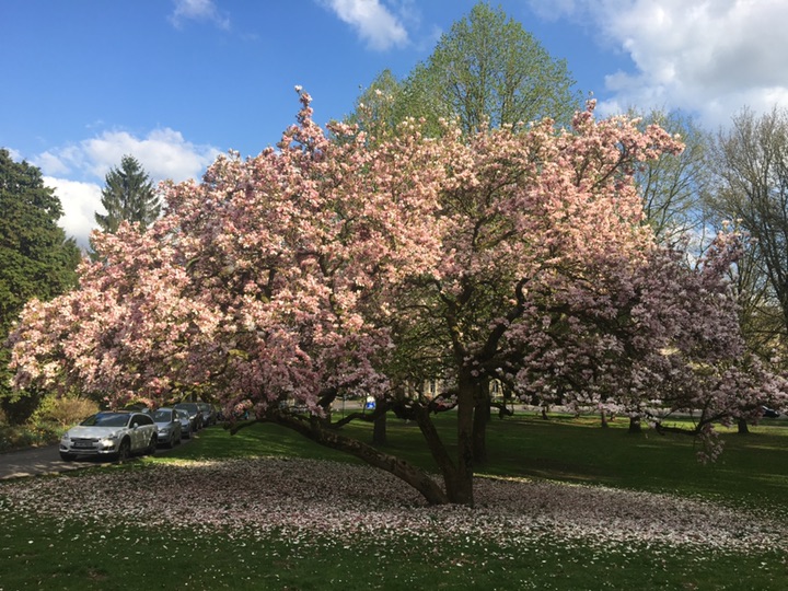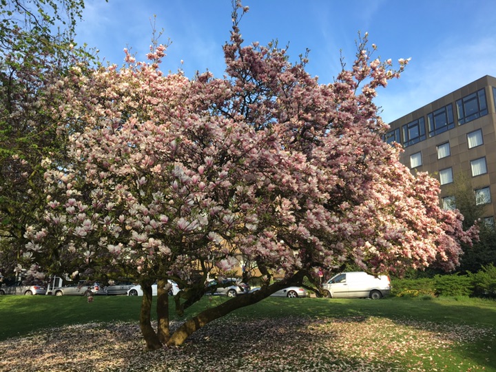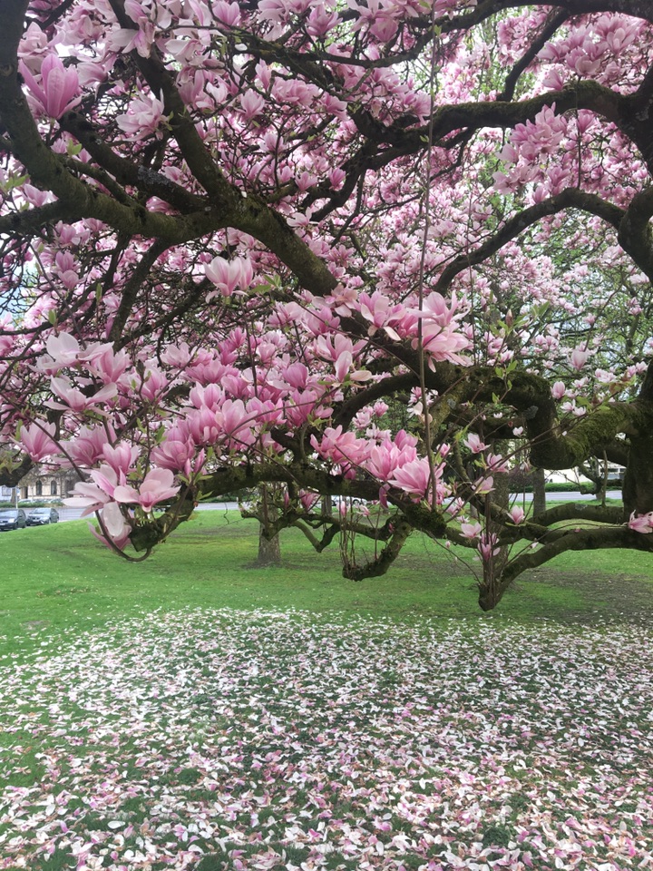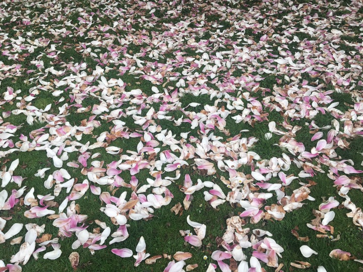 酒店门前有一棵很大的玉兰树,开满了花,树下散落了一层玉兰花瓣,很是壮观,如临仙境,顿时我想起了乌龟大师仙化而去的那棵桃树。