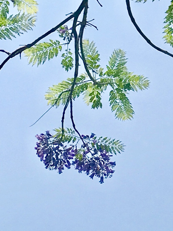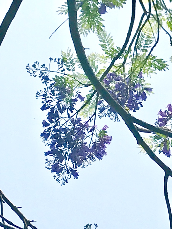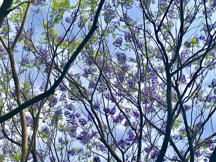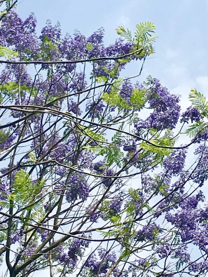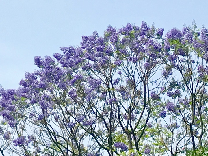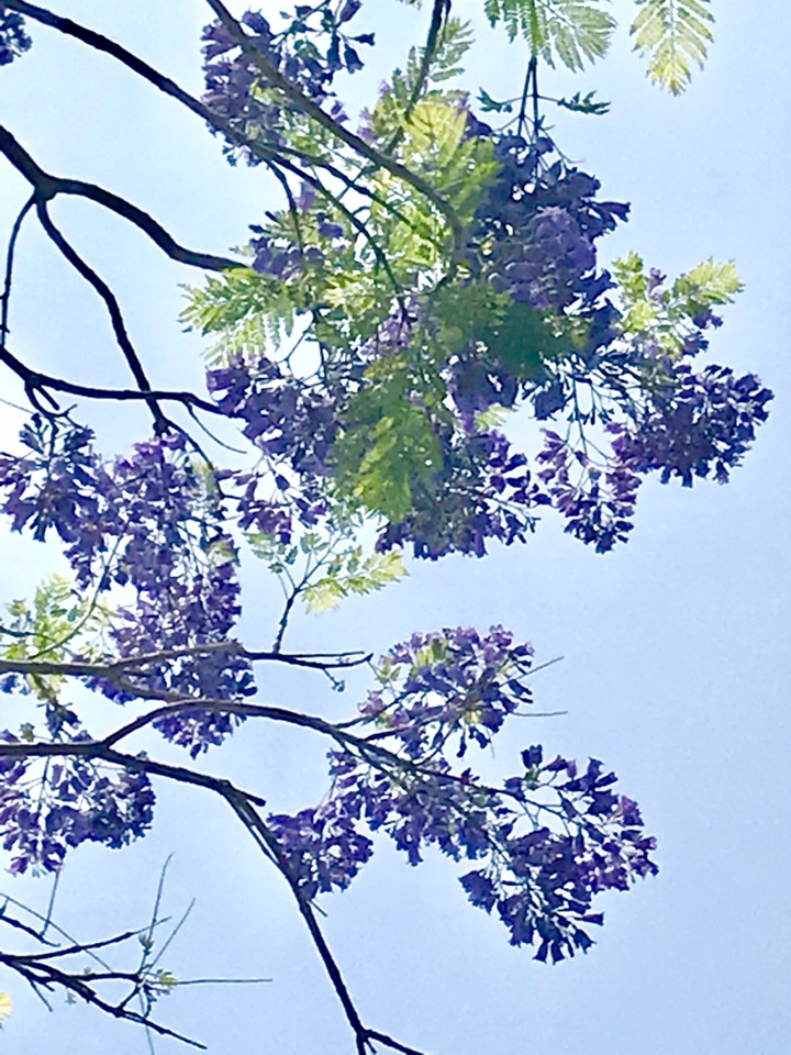 华富路上车来人往,转角处却有高高的蓝花楹,刹时幽静,一簇簇,一簇簇的花朵,清丽秀雅,触目,柔軟了目光,眼波蕩漾,渲染的蓝紫,袅袅的紫烟,恰有雀鸟飞过。