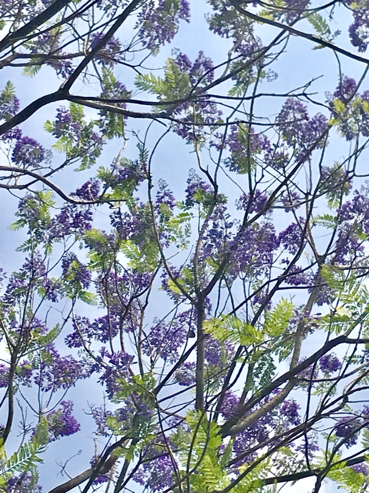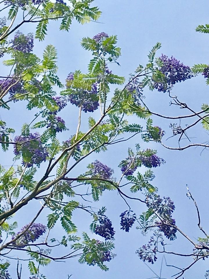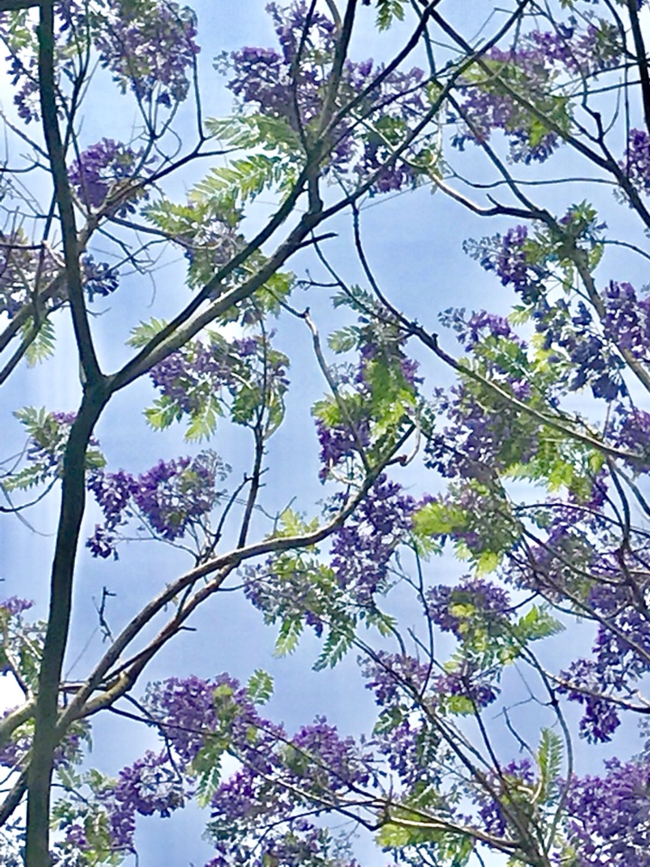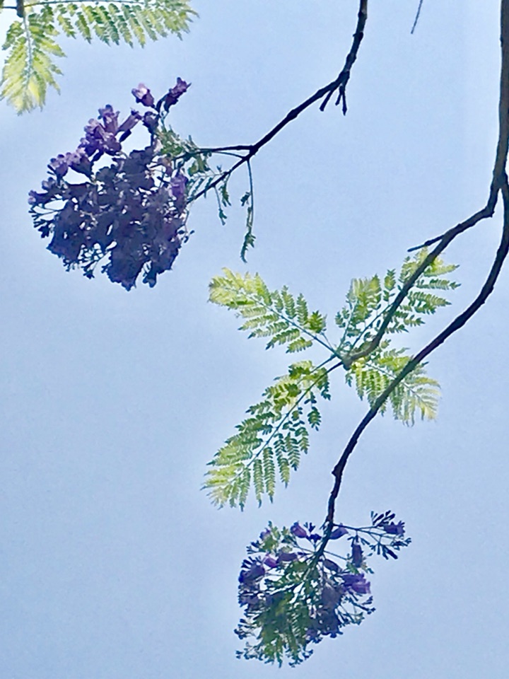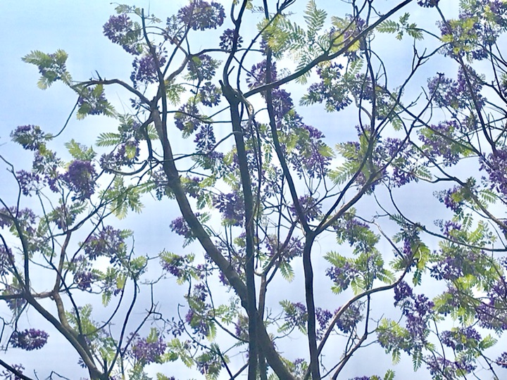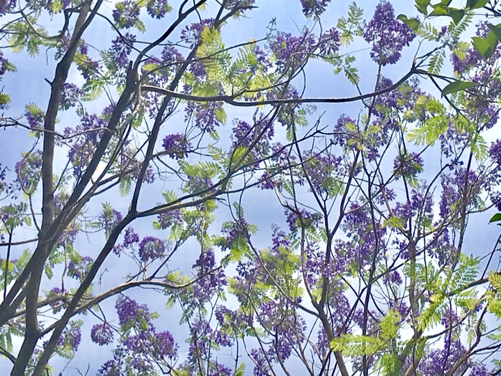 华富路上车来人往,转角处却有高高的蓝花楹,刹时幽静,一簇簇,一簇簇的花朵,清丽秀雅,触目,柔軟了目光,眼波蕩漾,渲染的蓝紫,袅袅的紫烟,恰有雀鸟飞过。