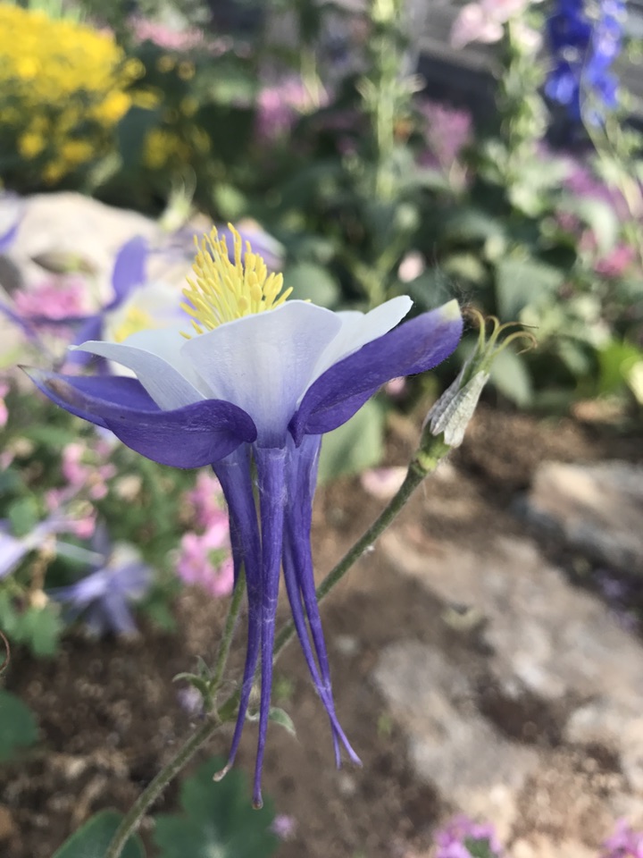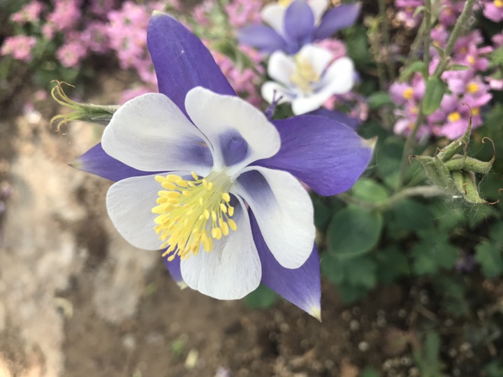 细看他的花也太奇特了,尤其是花后那长长的五根距,微微弯曲,像是怪物的触手、美杜莎的蛇发。距的顶端,隐隐约约可以看到内含的琥珀色花蜜。绕转到花朵的正面可以看到色彩迥异的两层“花瓣”,每层5都是瓣儿。外层“花瓣”实际上是耧斗菜的花萼,内层白色的才是正宗的。若是撩开外层花萼,就能发现白色花瓣跟后方的距是连在一起的。所以,其实每瓣花瓣儿都长成了一个长长的漏斗形。