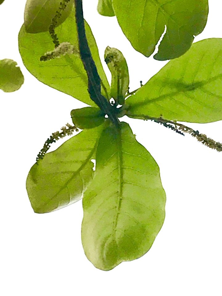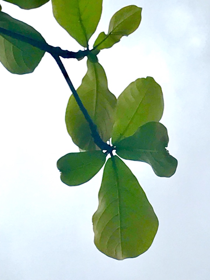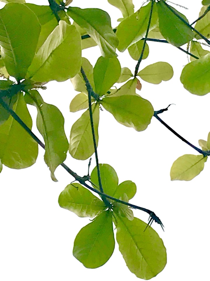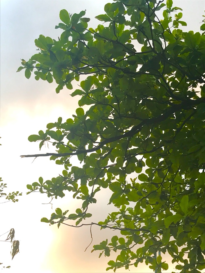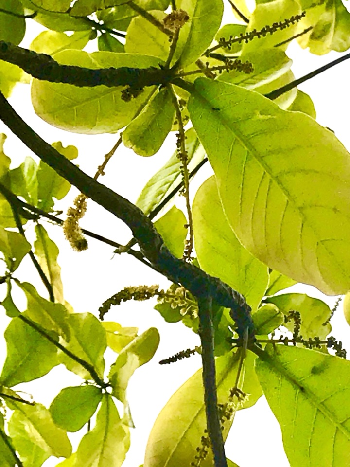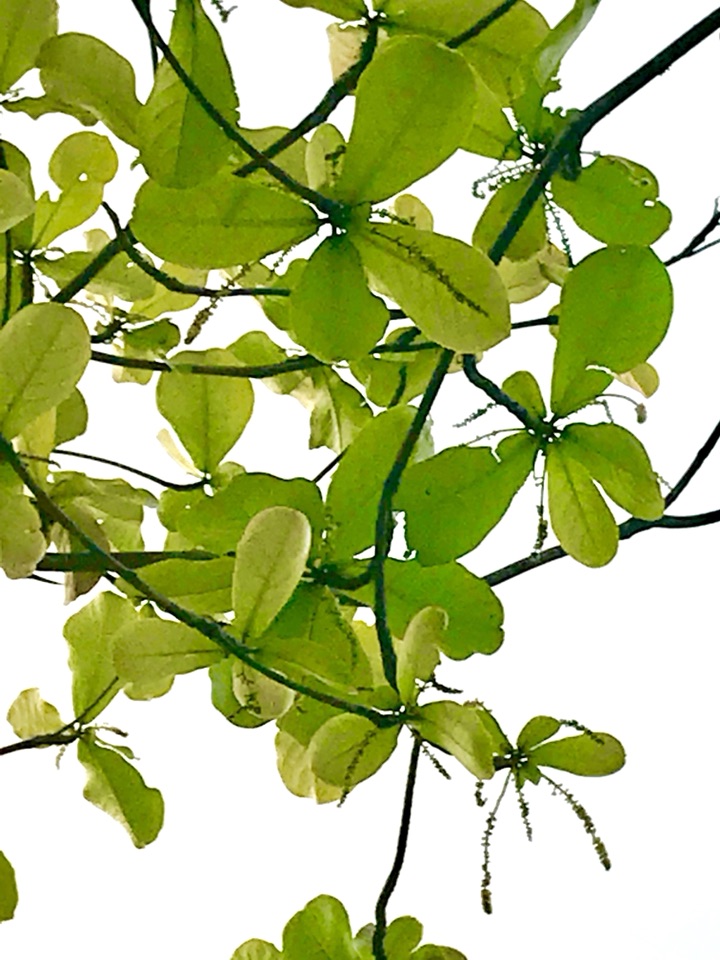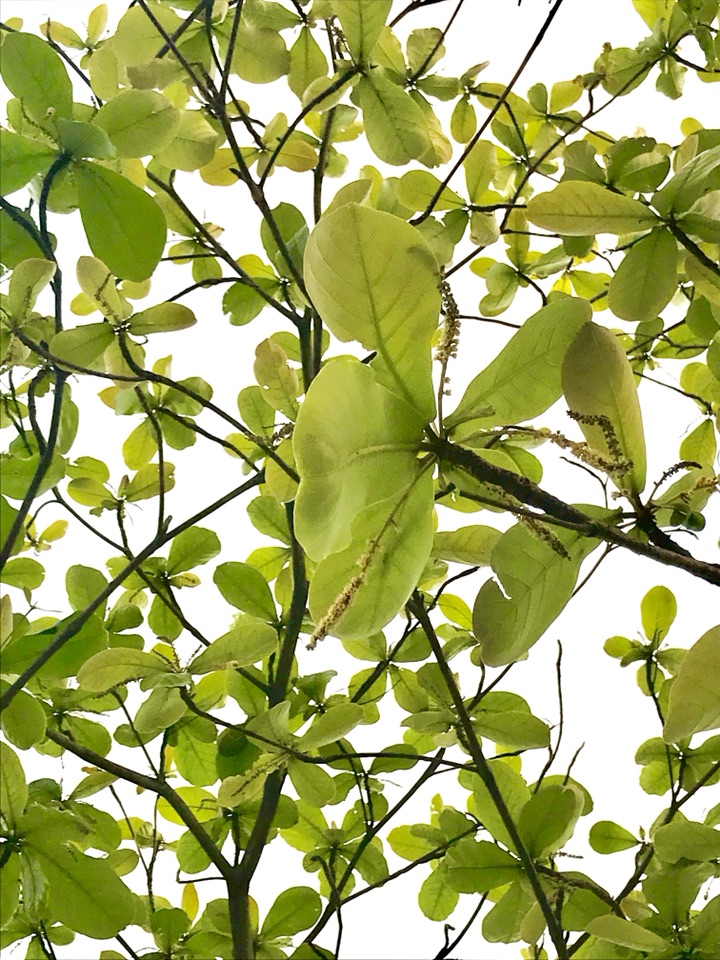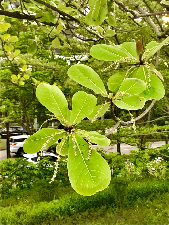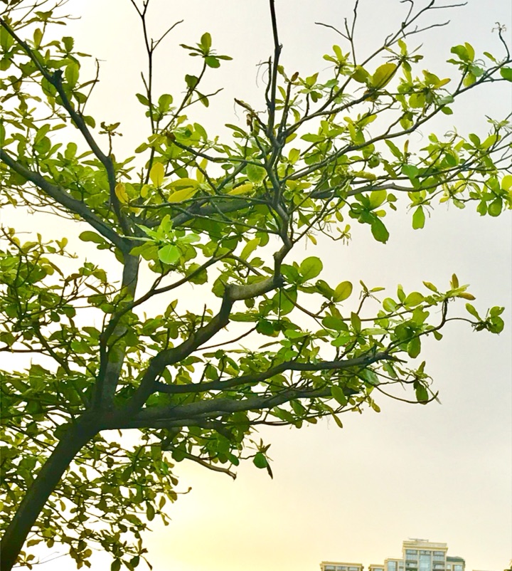 榄仁树又一次焕新,橫展的枝头萌出新綠,花不起眼,沒有花瓣的花,可是有花穂,衬托著叶卻美了,而叶形极像传统乐器琵琶,于是就有了琵琶树的美称,在国外称为吉他树,也称大叶榄仁。樹冠宽大平展开,极其美观,夕阳下,片叶有光,显得更美。