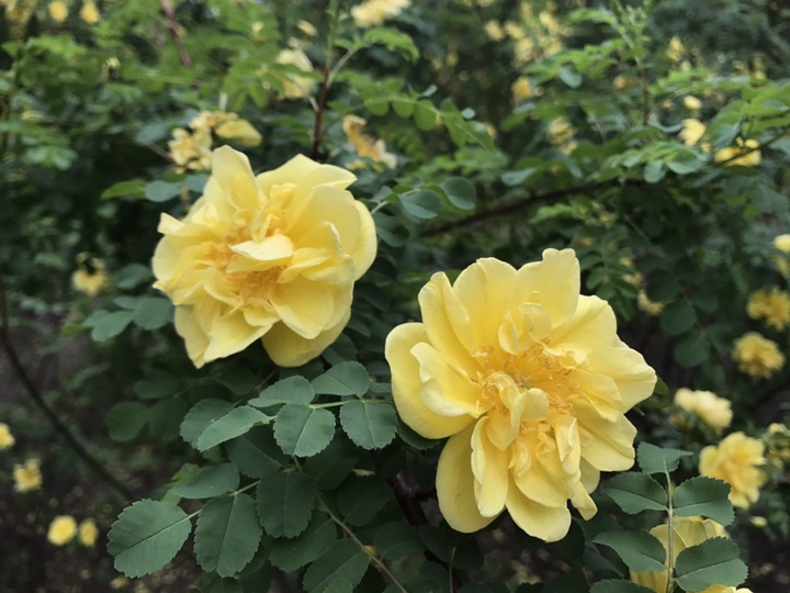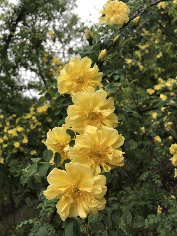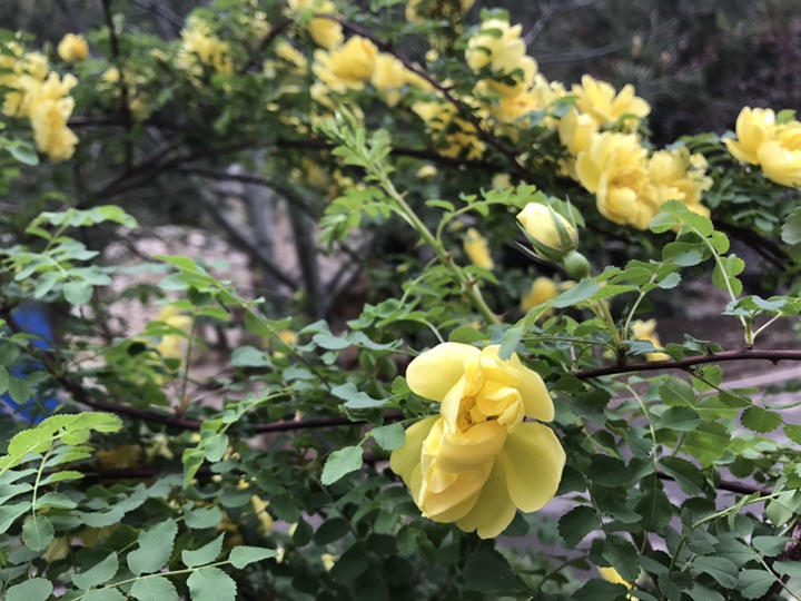 相对于单瓣黄刺梅来说,重瓣黄刺梅更显优雅妩媚富有质感。枝枝串串的花朵流泻,重重叠叠的花瓣如玫瑰般灿若彩霞流动成花的瀑布,充满了青春活力的气息,为这姹紫嫣红的春天增添一份别样的风情!