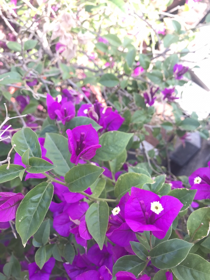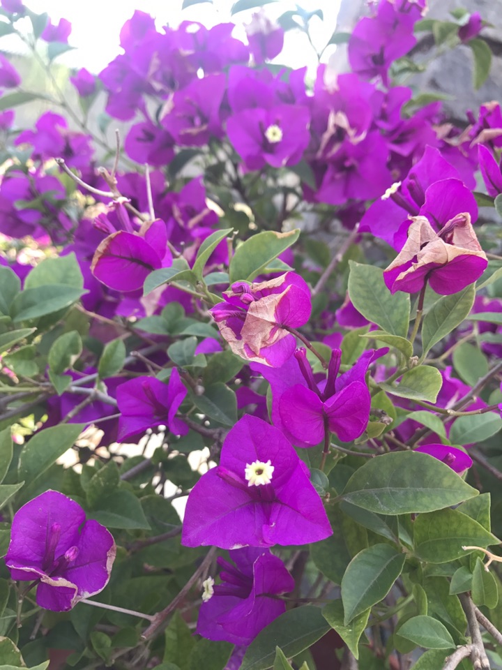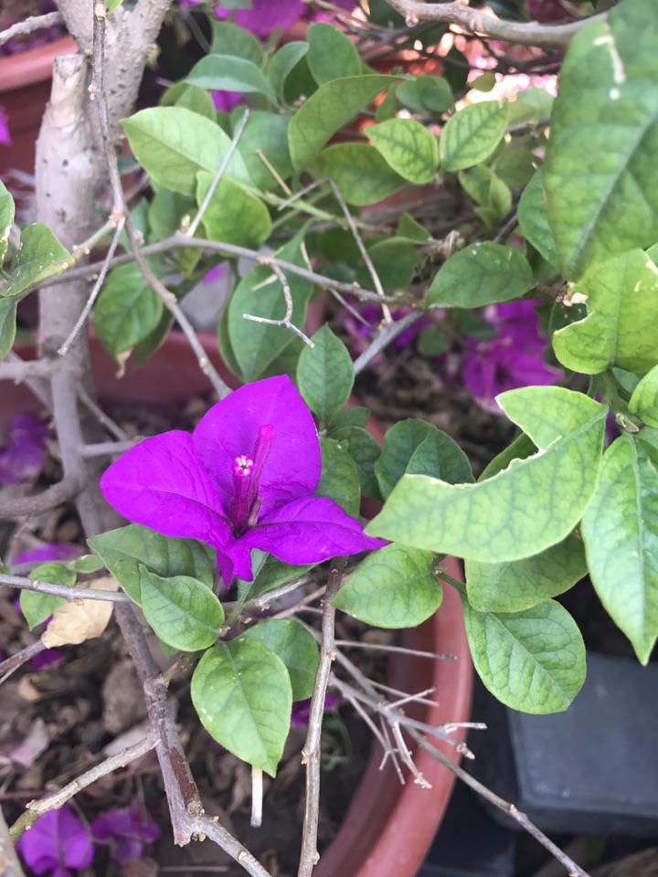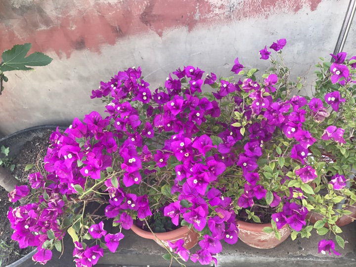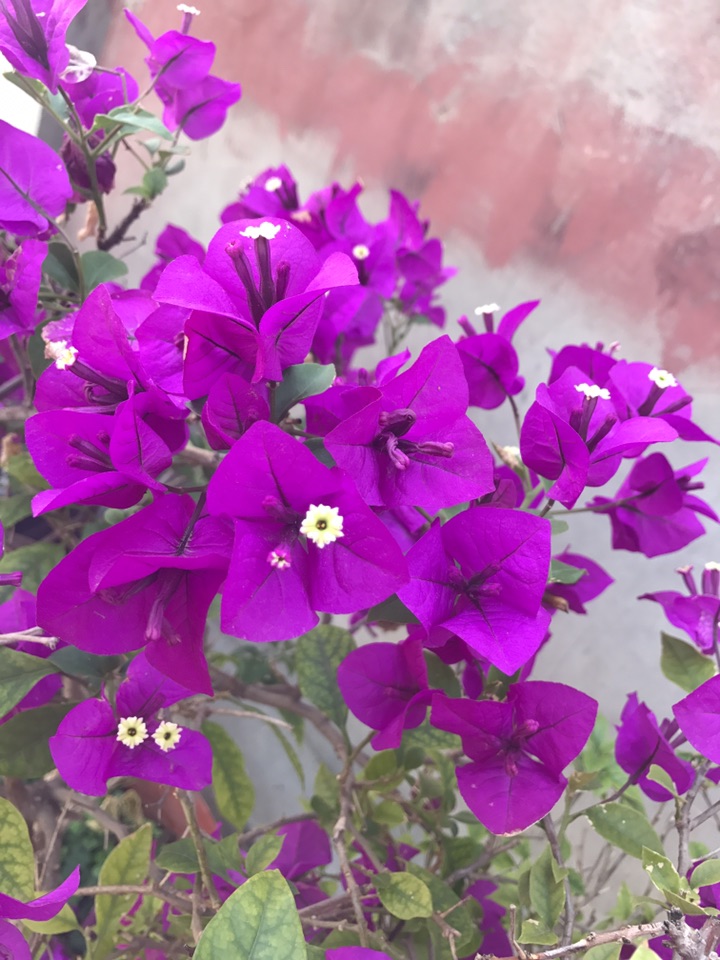 叶子花,紫茉莉科叶子花属木质藤本状灌木,别称三角花、室中花、九重葛、贺春红,花很细小,黄绿色,三朵聚生于三片红苞中,外围的红苞片大而美丽,有鲜红色、橙黄色、紫红色、乳白色等,被误认为是花瓣,因其形状似叶,故称其为叶子花。花期可从11月起至第二年6月。