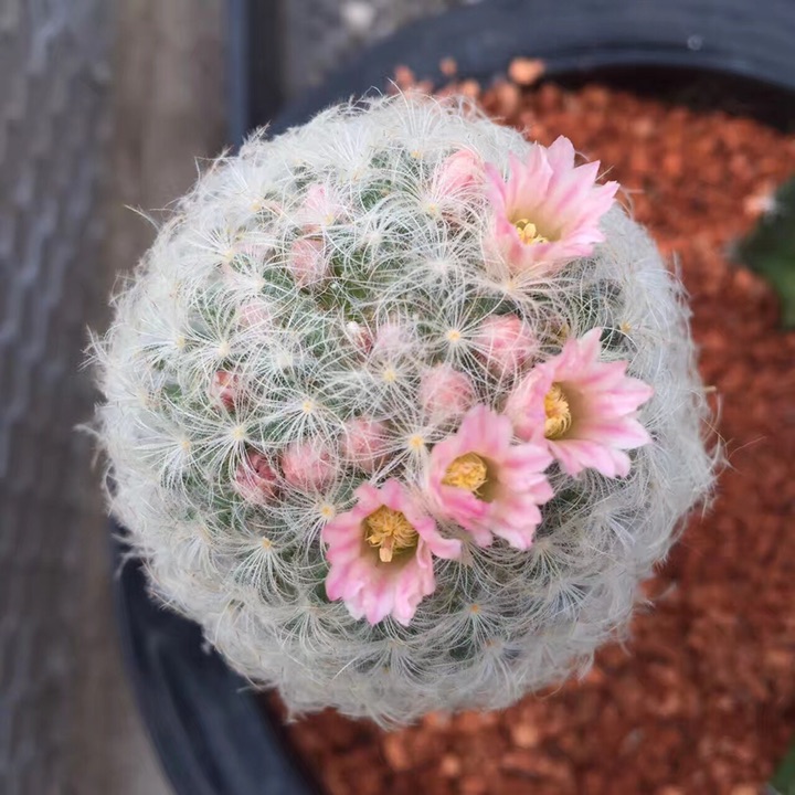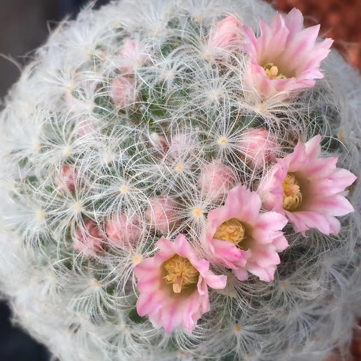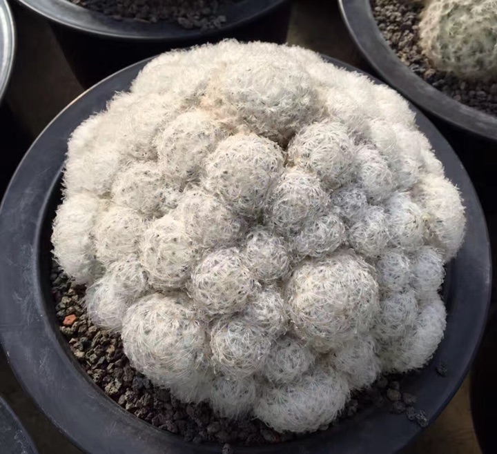 乳突球属的白星:刺座羽状、雪白、密集,不扎手,容易群生,就像毛绒玩具。传统的开白花,不显眼,这次终于有了渐变的粉色花,值得期待。