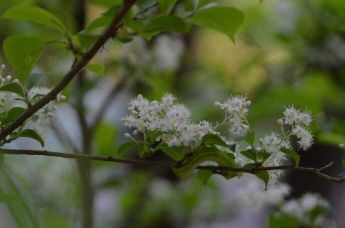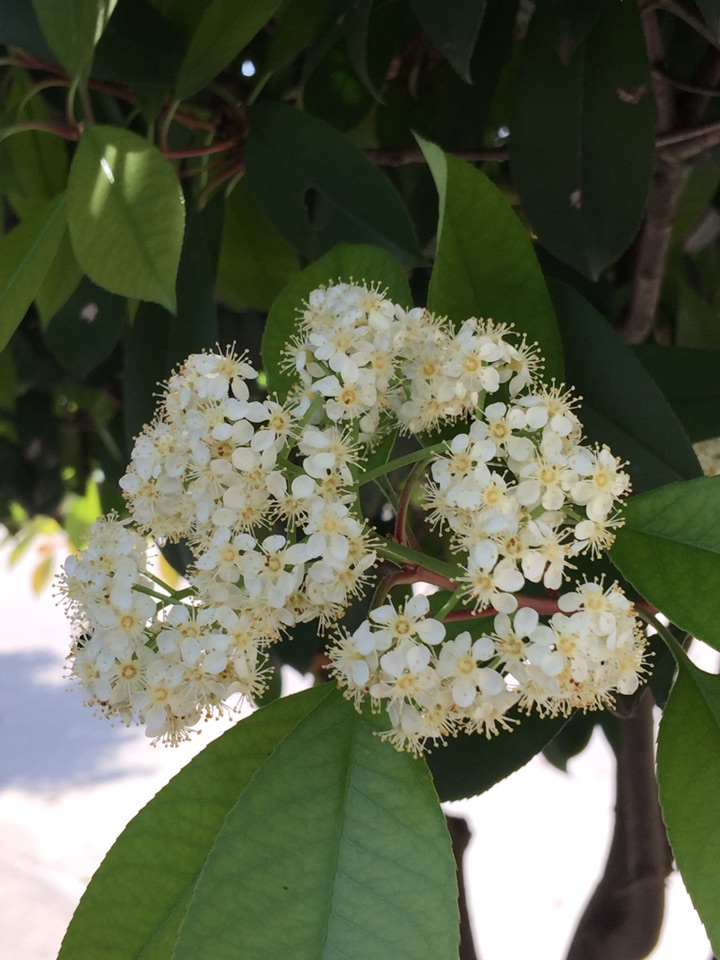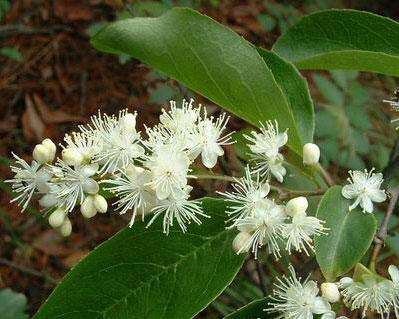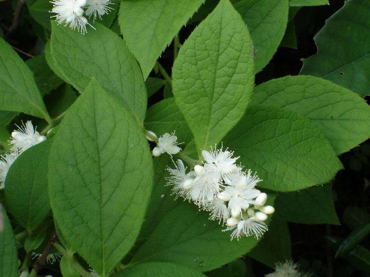 花: 圆锥花序!长5-8cm,通常有柔毛;苞片通常条形,有褐色腺点,早落;花萼长2-3mm,萼筒褐色,无毛或有疏柔毛,裂片半圆形或卵形,稍长于萼筒,淡黄色,有纵脉纹,边缘有毛;花冠白色,长4-5mm,5深裂几达基部;雄蕊40-60;花期5月。子房2室,花盘具5个凸起的腺点。