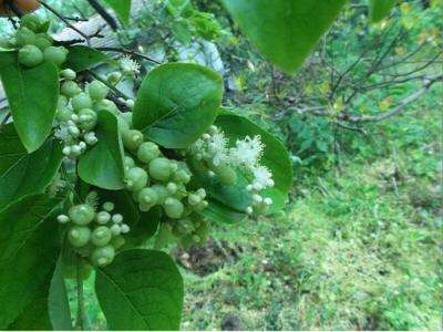 果: 果熟期7月。核果熟时蓝色,卵状球形,稍扁斜,长5-8mm,先端宿萼裂片直立。