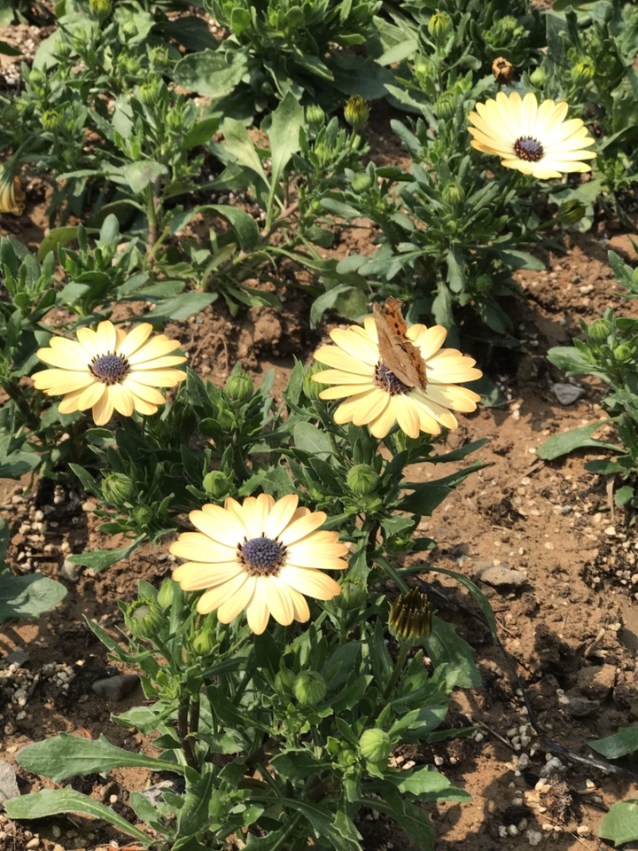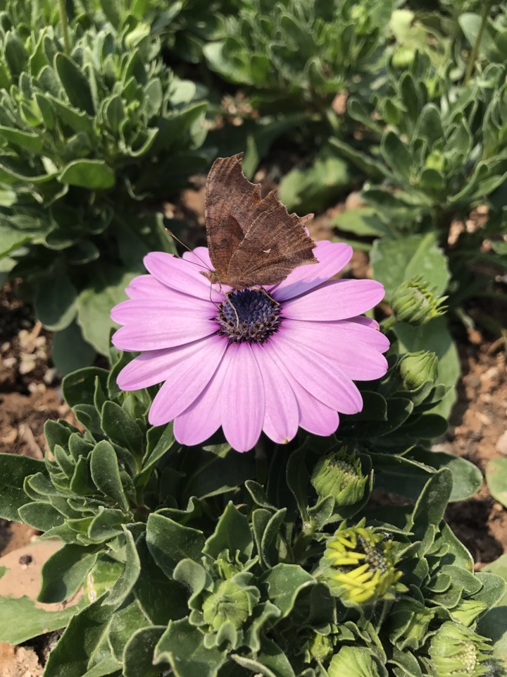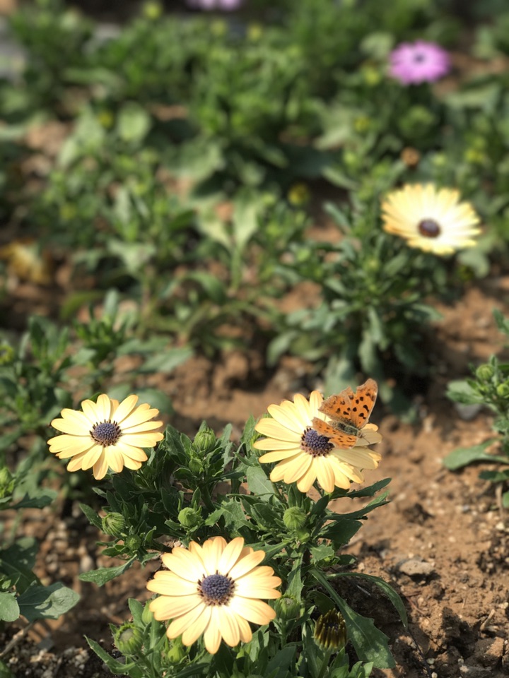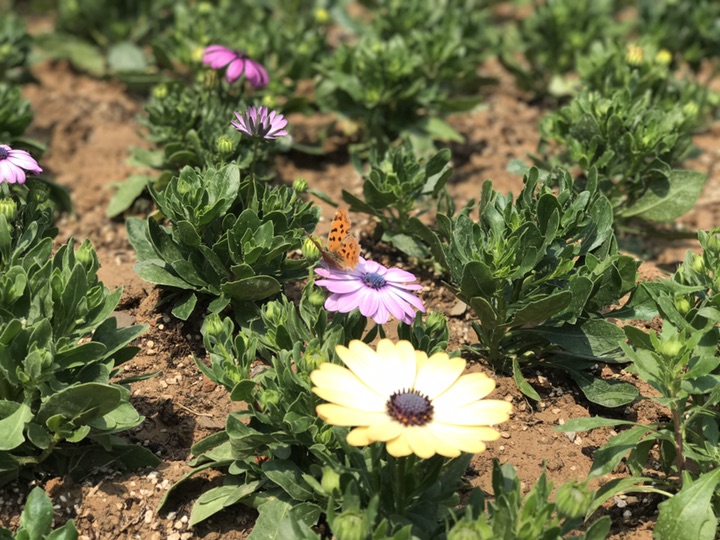 这次看到它还是在京韵园,假山的下面开了好多艳丽的花朵。粉色的在外围,黄色的在中间,零星的夹杂着一些白色。引来许多阿姨在这边拍照,舞动着丝巾各种摆拍。有只蝴蝶飞来,这朵落落脚那朵花沾沾边,总之就是没个定数。不是距离太远就是时间太短,要么就是没有把翅膀打开,追着它拍了好久,额上沁出粒粒汗珠,总算是拍到了几张能看的。