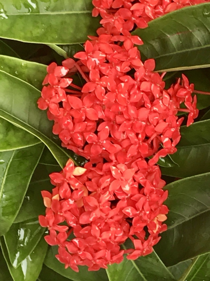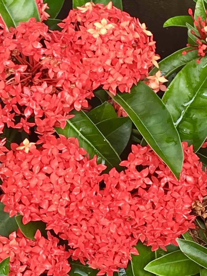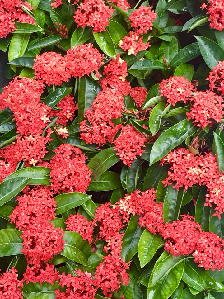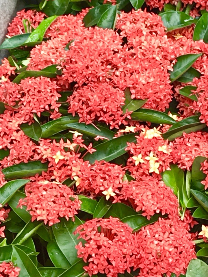写字楼侧门的阶梯旁,龙船花开的那是一个灿烂,花团錦簇,一场雨后,水淋淋的,显得更加艳丽夺目,脸都給花儿映紅了。