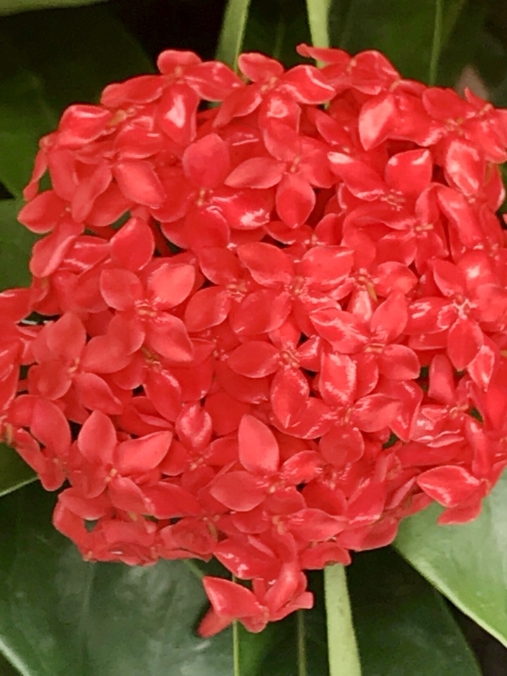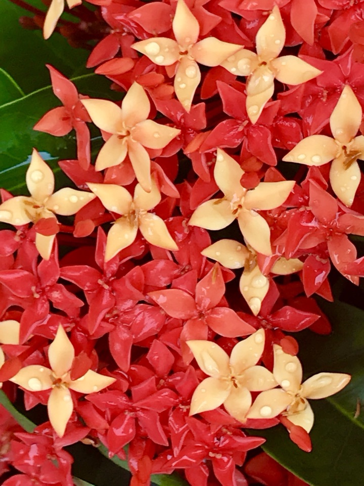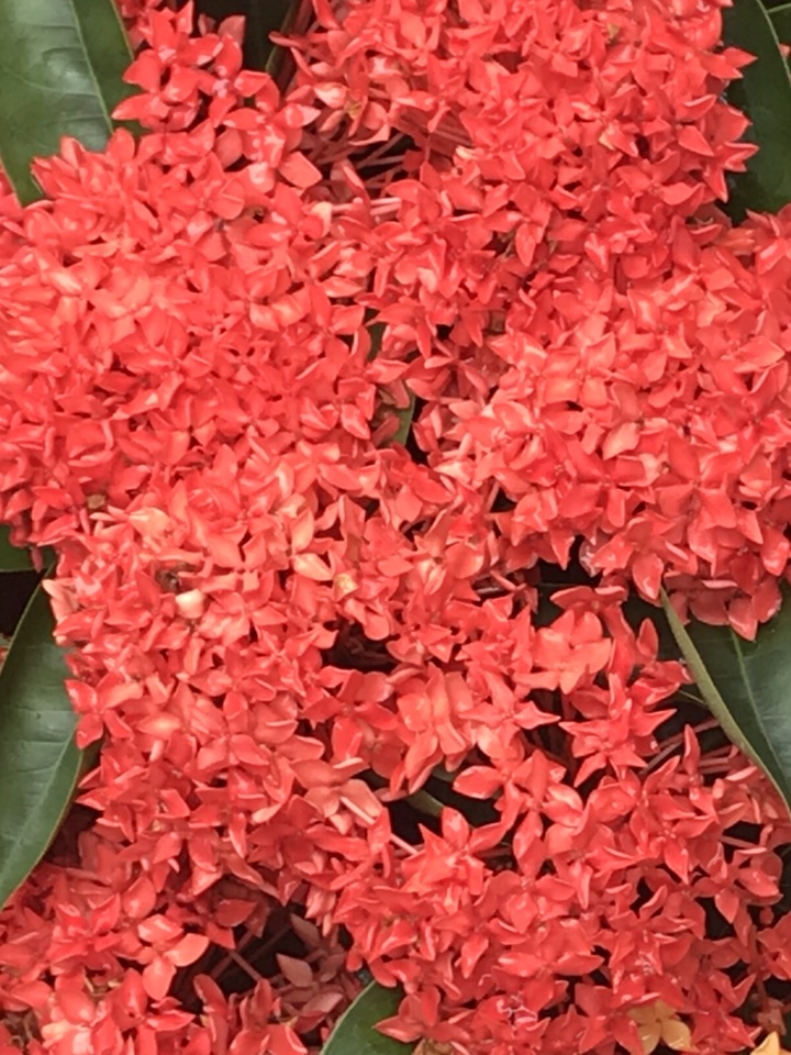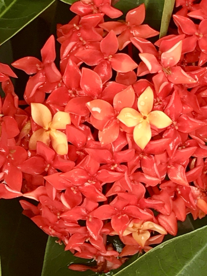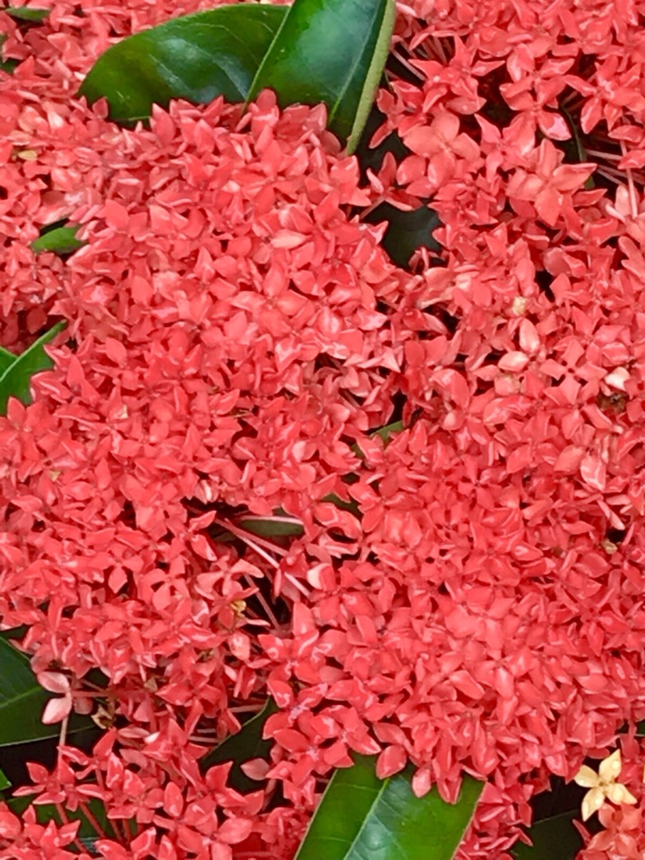 写字楼侧门的阶梯旁,龙船花开的那是一个灿烂,花团錦簇,一场雨后,水淋淋的,显得更加艳丽夺目,脸都給花儿映紅了。