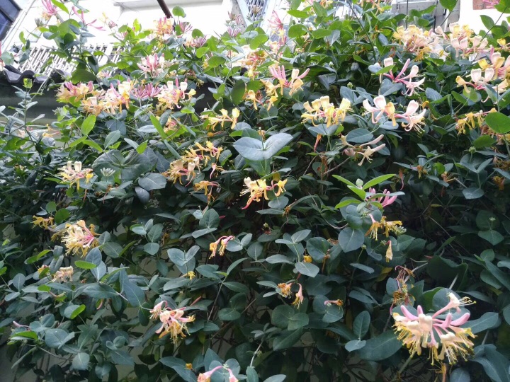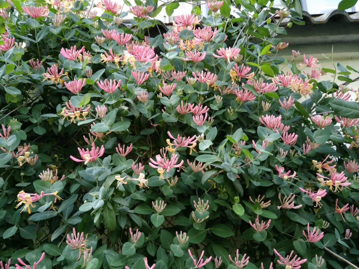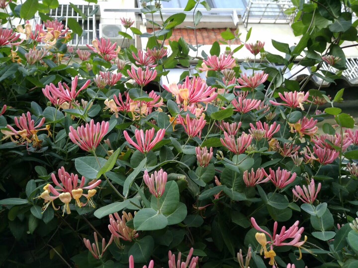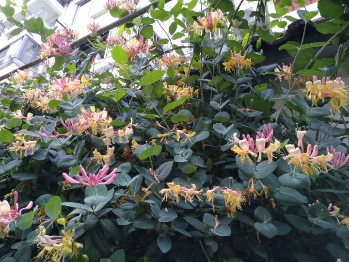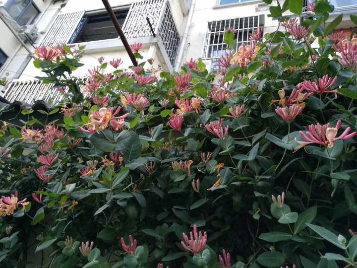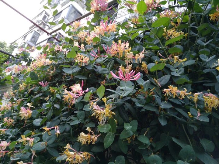 之前都没有仔细观察过,原来它的颜色还富于变化。花蕾在开放前由紫红变大红,花开时先为粉红,花开后变成红、黄、白相间,等到它要谢了又变成了黄色,凋零的它感觉跟普通的金银花没差了。
