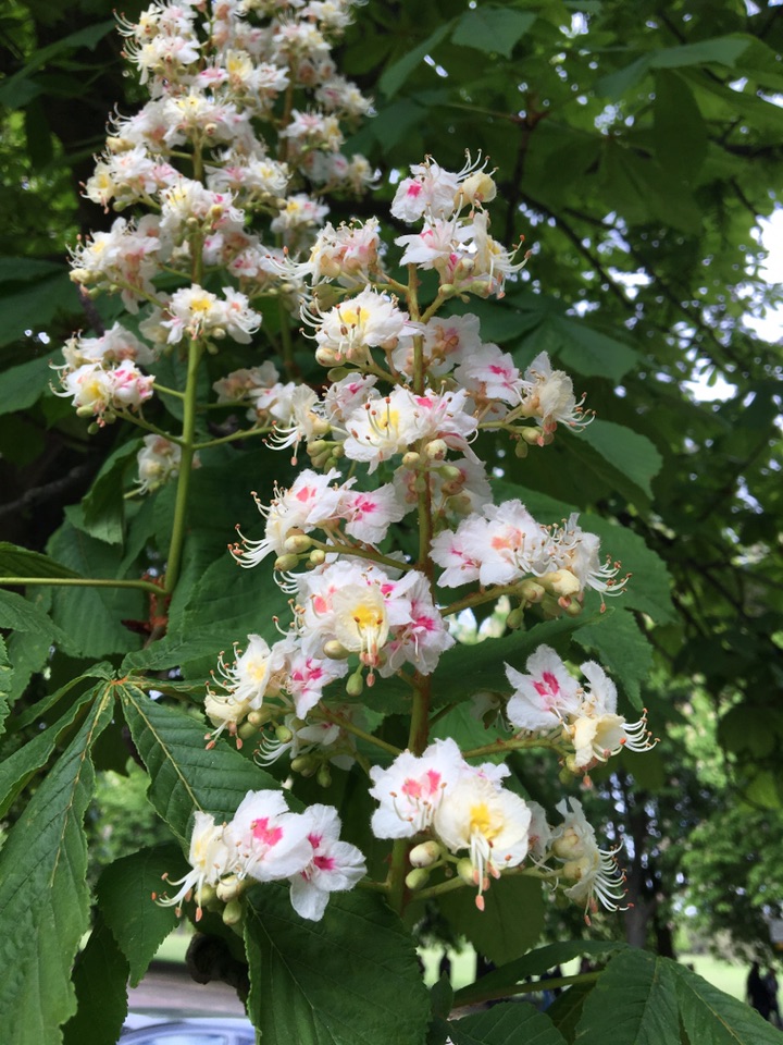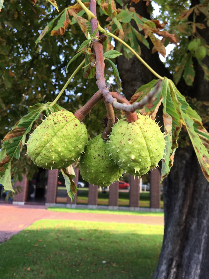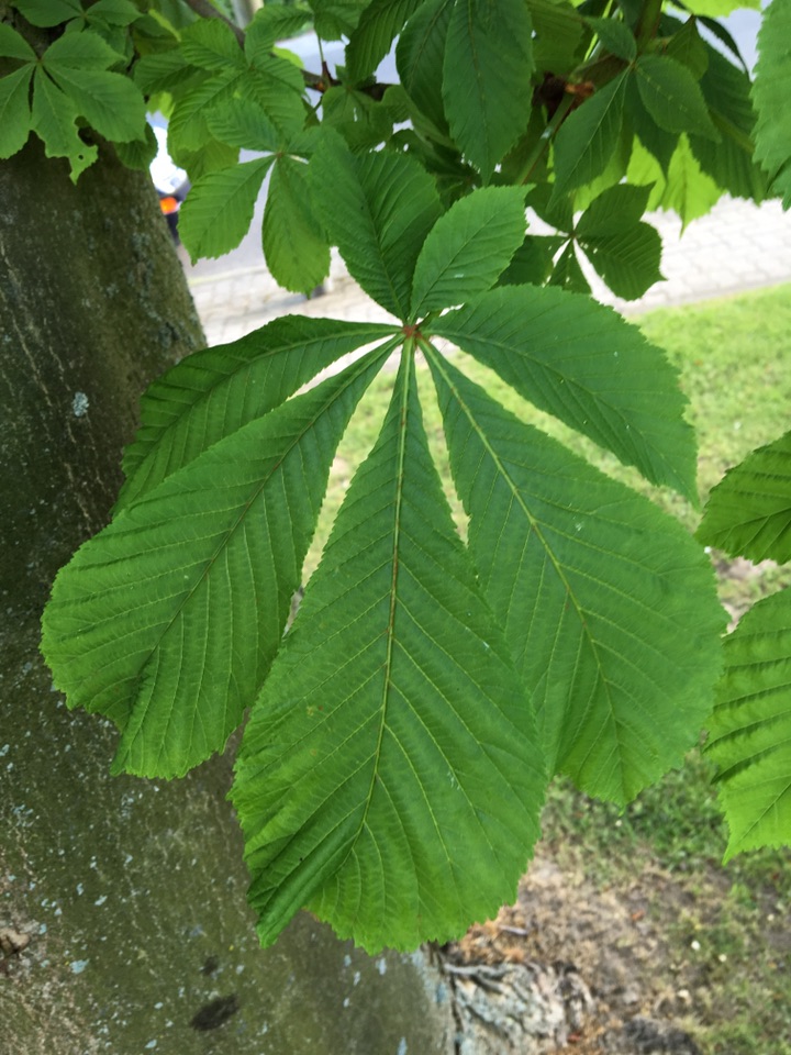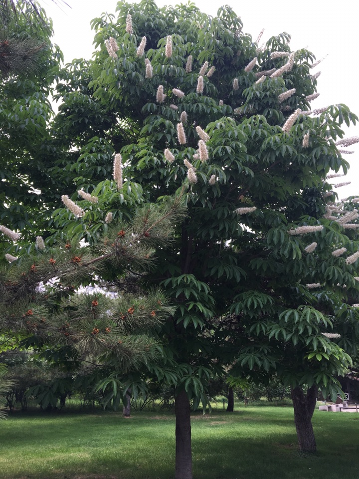 七叶树又名马栗,著名景观树,树木高,花簇大,叶子七片聚在一起,其果如栗。