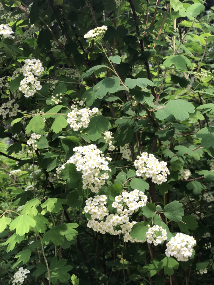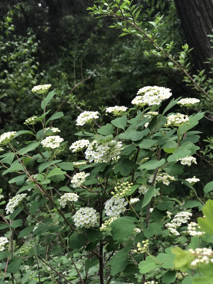 最近看到的小白花有点多,且都是花朵繁茂,簇簇拥拥,盛开时枝条全部为细巧的花朵所覆盖,形成一条条拱形花带,不管近看远观一清二白三鹅黄点缀的林间小径趣味盎然,十分惹人陶醉。原本一直以为它是麻叶绣线菊,可最近又突然出现了一个菱叶绣线菊的声音,让我一时迷惑。