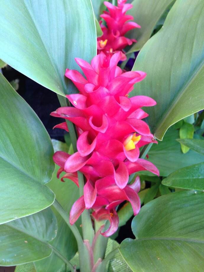 红花月桃又名红姜花,它的整个花序婷婷玉立,火红如炬,圆柱形的花柱从四面八方开出朵朵红花,花期长,极为美丽。