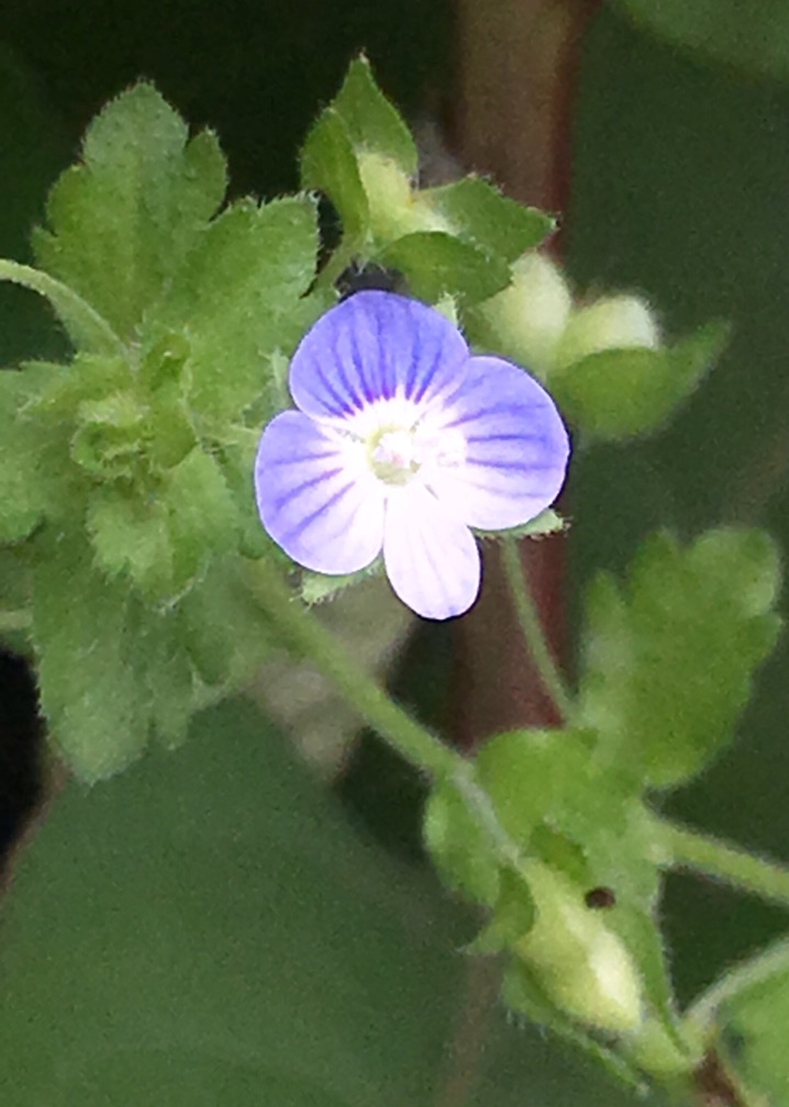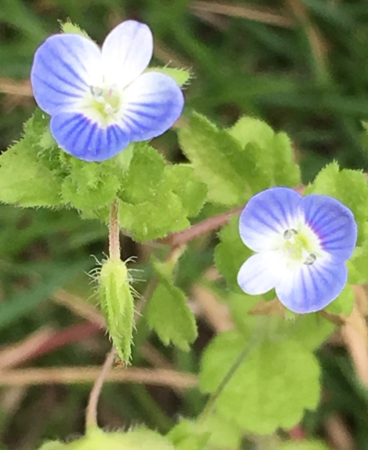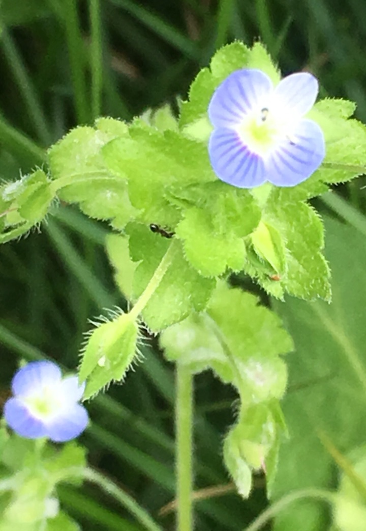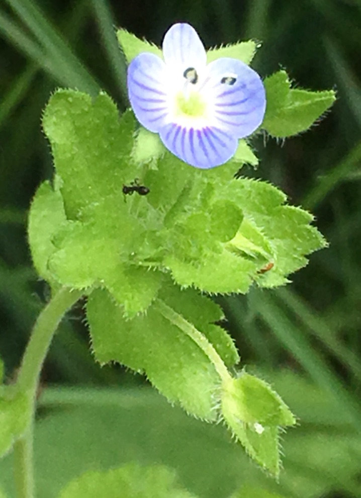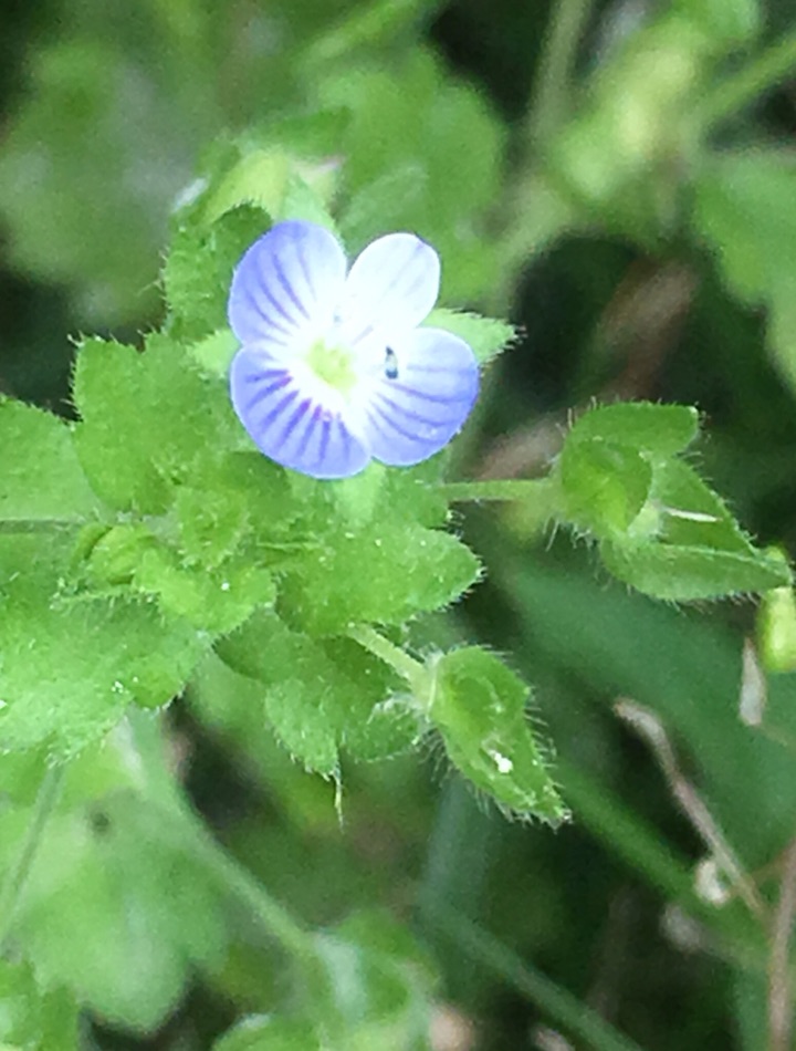春天百花盛开的时候在一些不起眼的荒地上很经常会有一些地方那个会长出一种带有蓝色的小白花,比黄豆的大小还略小些,星星点点地点缀在绿地上,还挺热闹的。凑近了蹲下来看,这些小花来自于一种伏生植物,茎自基部分枝,斜向上生长。花都是单生于苞腋的,花下有细长的花柄,花冠淡蓝色,有四片花瓣,花瓣上带着放射状深蓝色条纹,这让它显得更好看了。