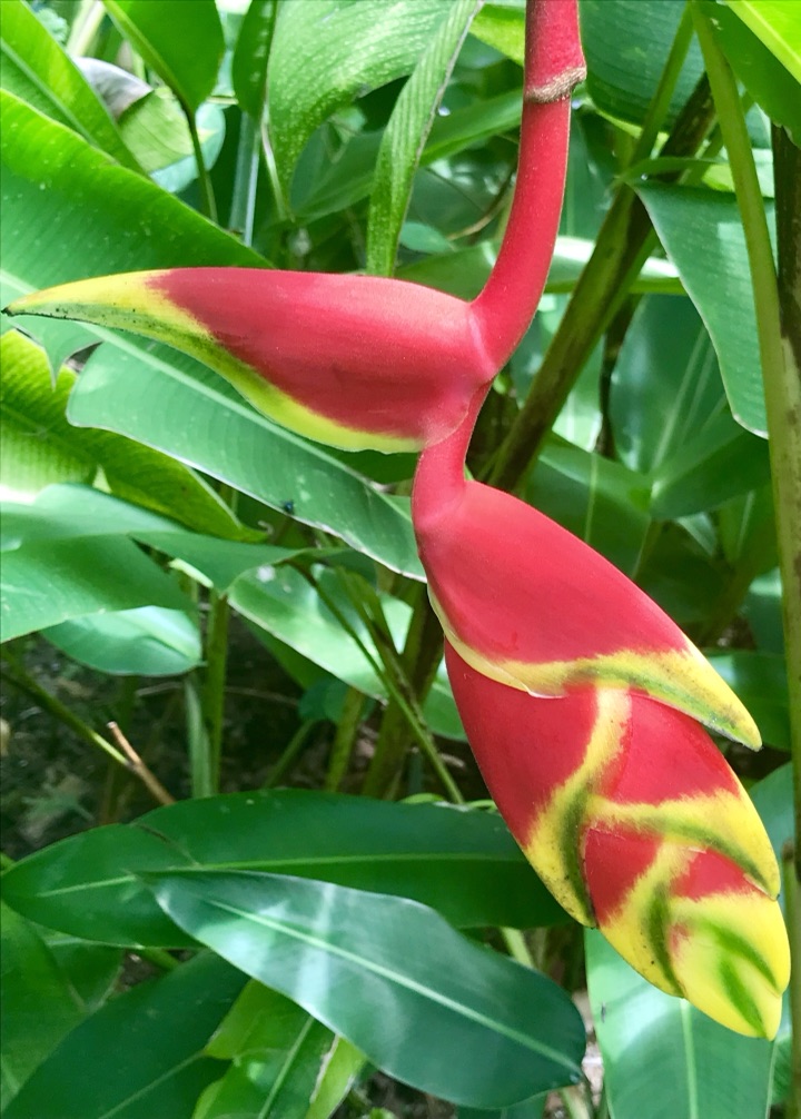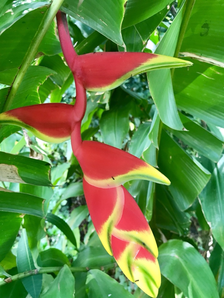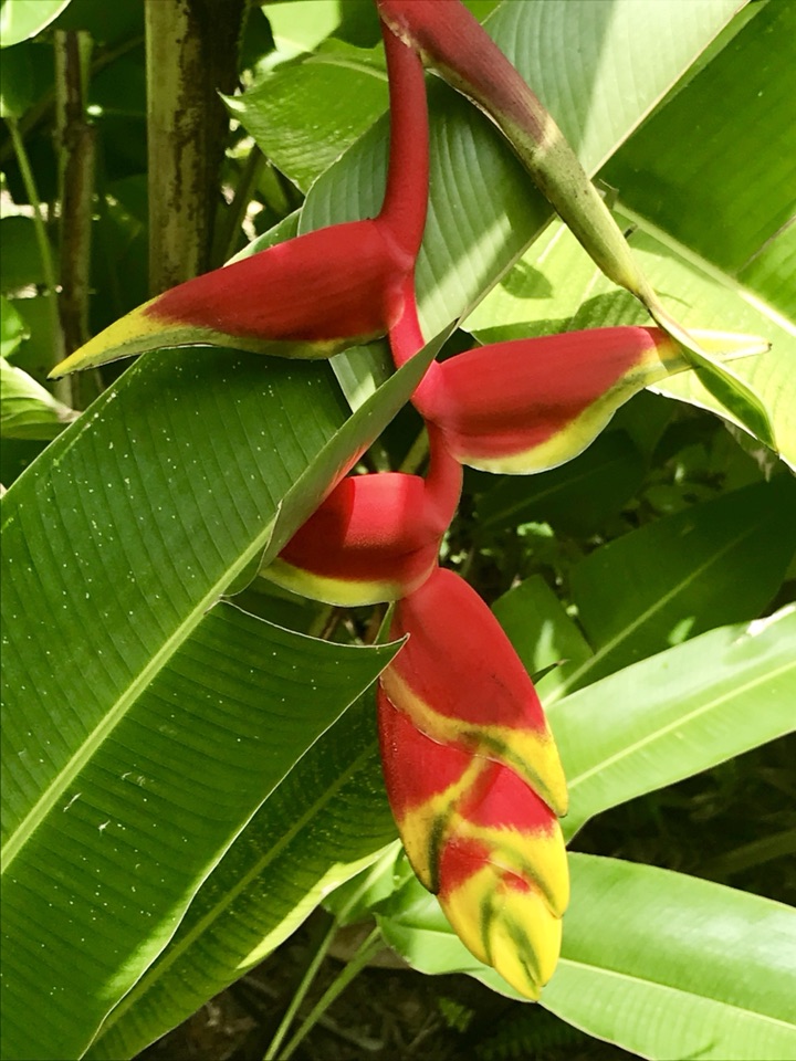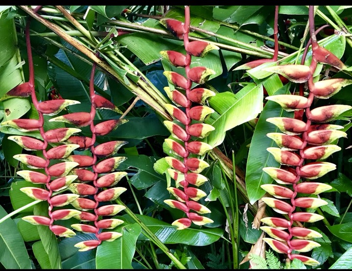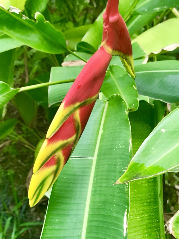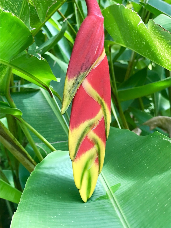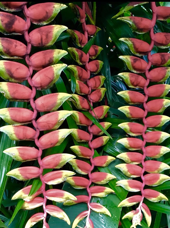 金嘴蝎尾蕉,奇葩奇葩,花苞红彤彤,镶着金绿交错的花斑纹,未开时像条鱼,慢慢的耍把戏般松开,变成一只“啄木鸟”,接着形如龙虾缺了一块的大钳子,左一个右一个拴排成串,不断伸长(可达半米),犹如垂挂的多彩鞭炮,喜庆!