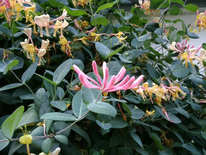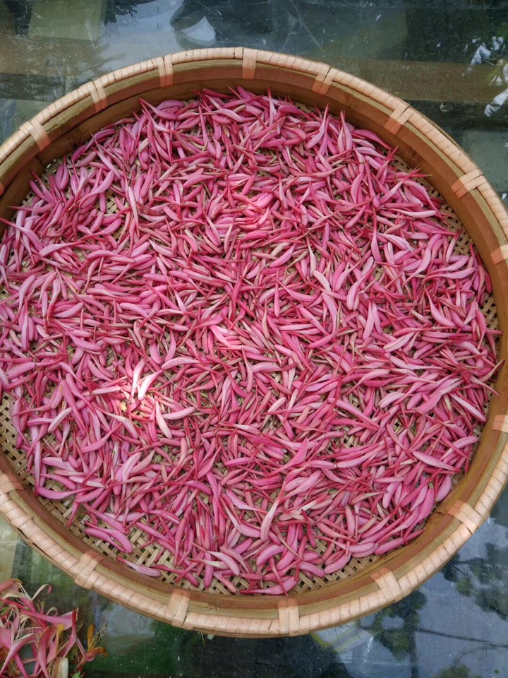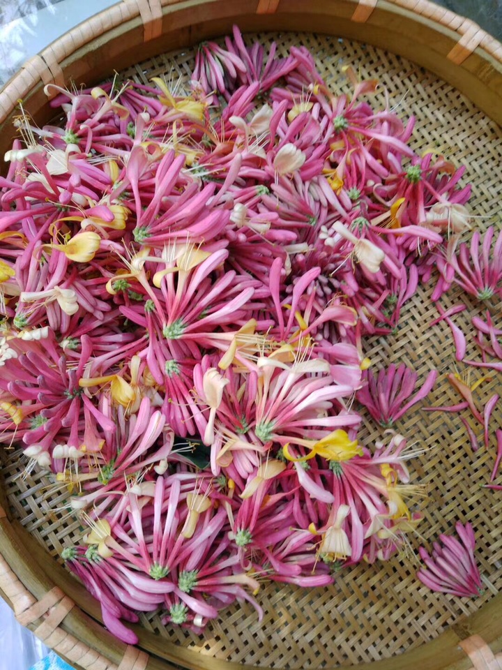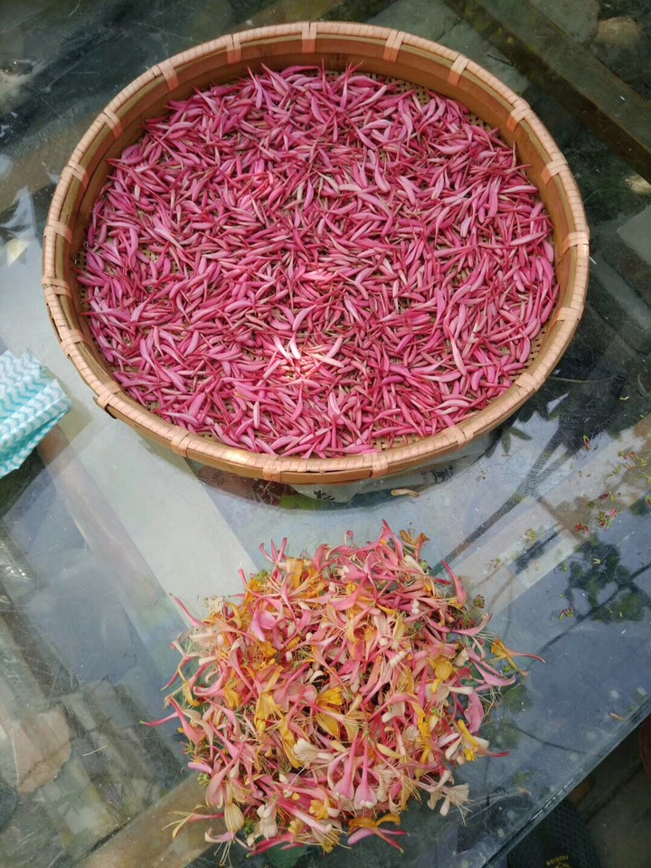 原来这个红色的金银花还是可以食用的,朋友采摘了好多制作成了金银花茶晒了朋友圈。看着怪美的,让人不由想起婺源的篁岭晒秋,我借图发个话题,供大家欣赏!