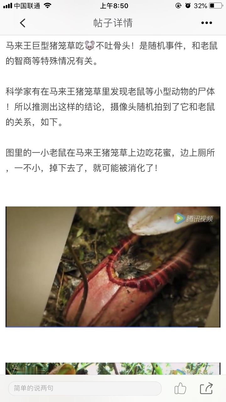:世界最大的肉食植物:马来王猪笼草吃老鼠不吐骨头。这视频很容易找,我已看过,有点意思,有点好玩。