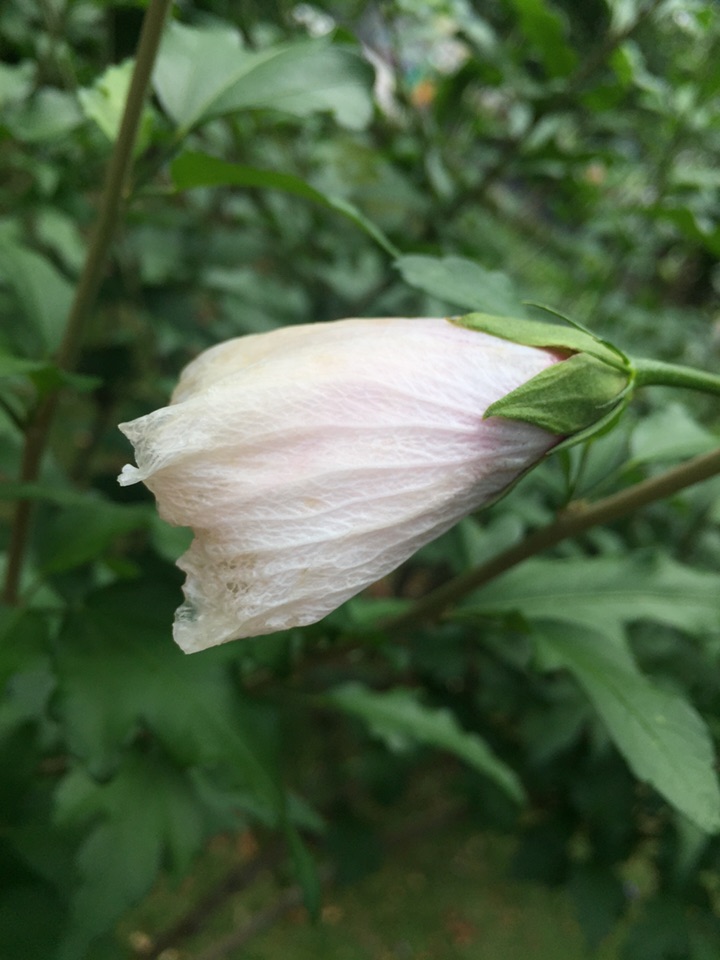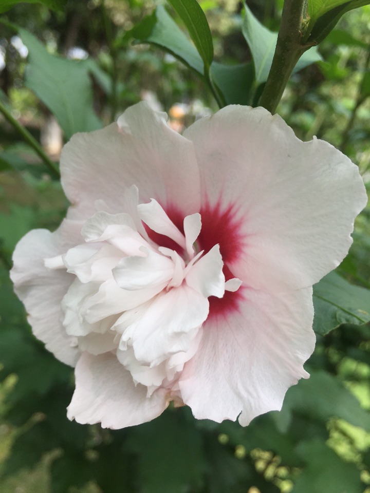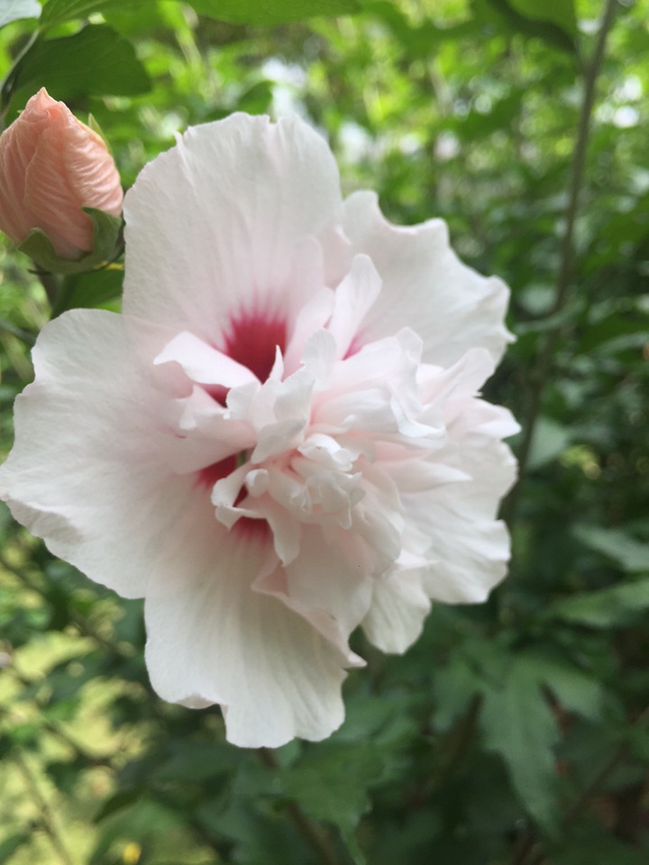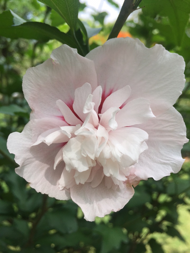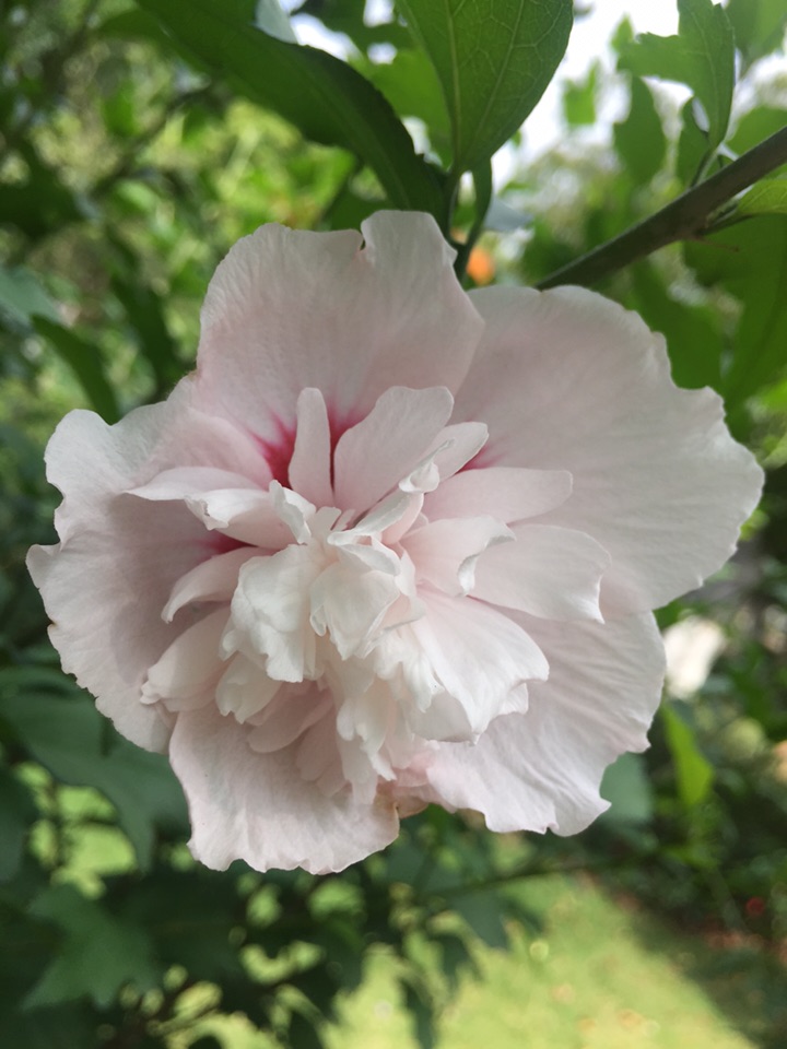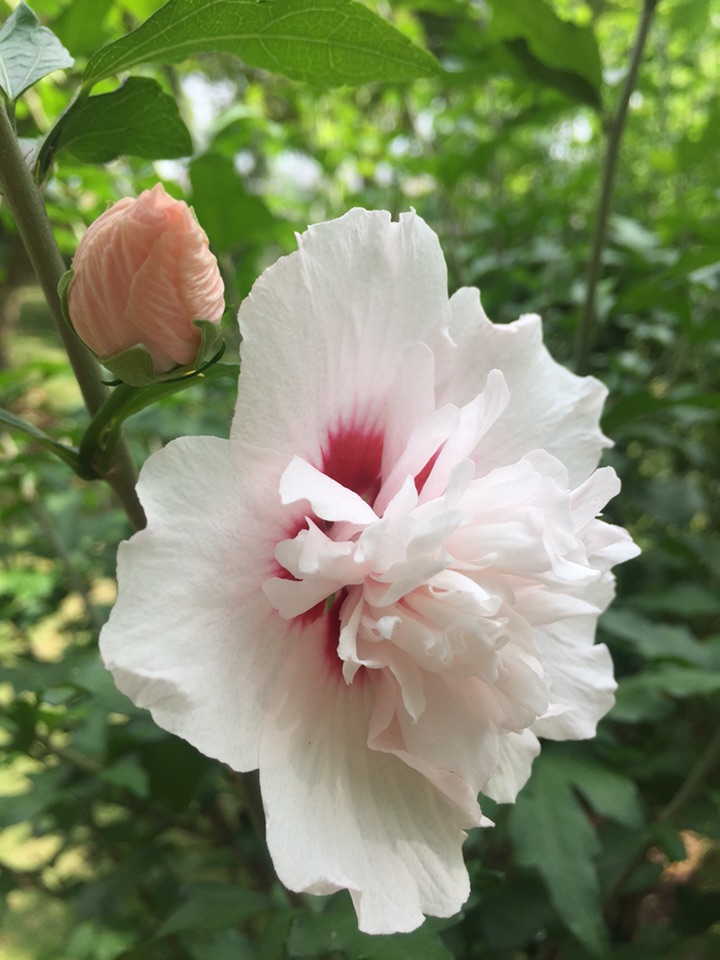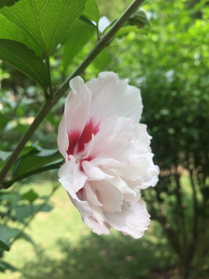 昨天下班后,散步于河堤,邂逅白花重瓣木槿,一时为之惊艳。