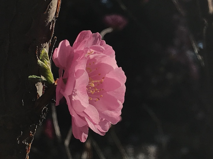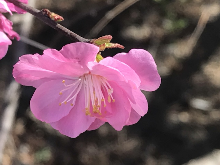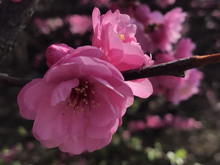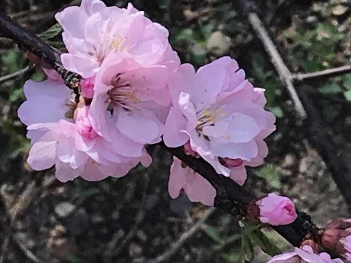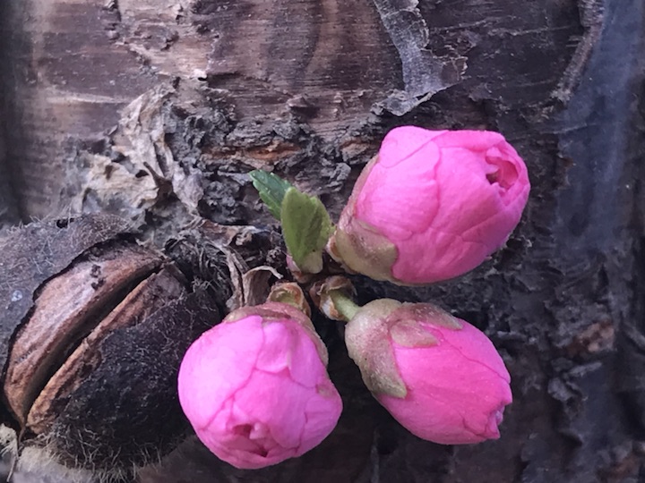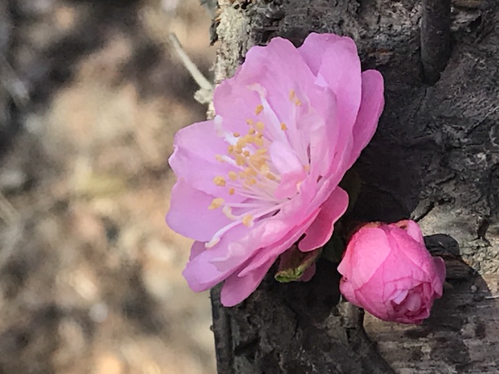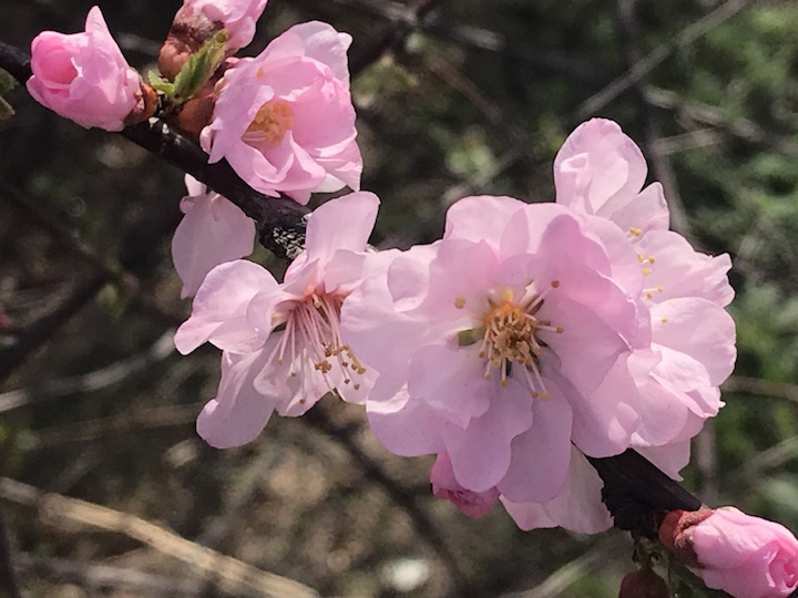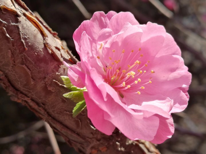 枝紫褐色,叶宽椭圆形至倒卵形,先端3裂状,缘有不等的粗重锯齿;花单瓣至重瓣,紫红色,1~2朵生于叶腋,花期4月;核果红色,近球形,有毛。