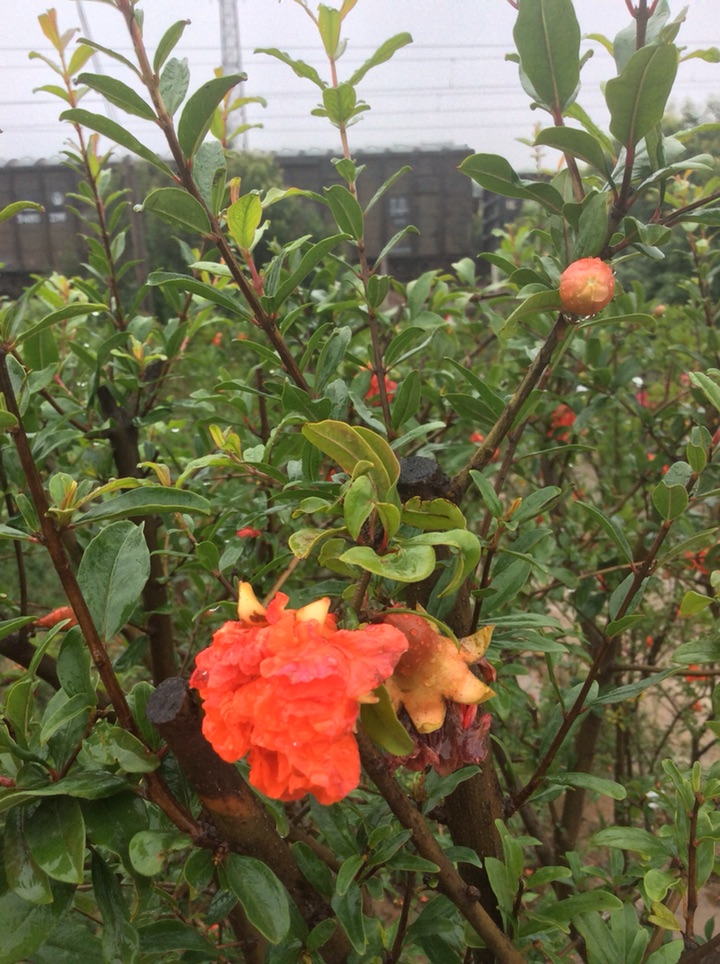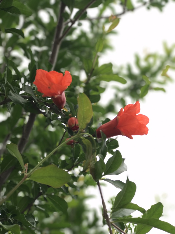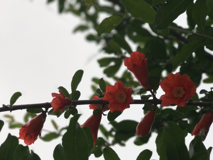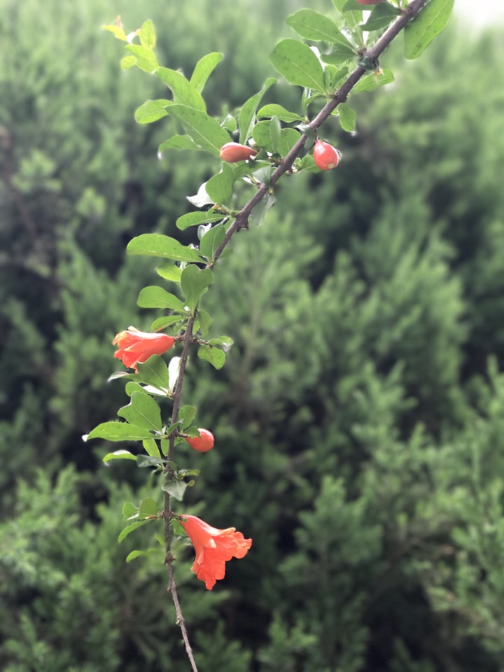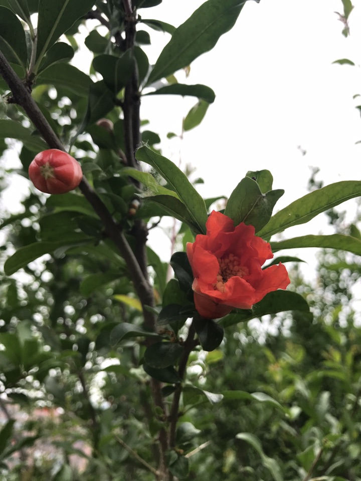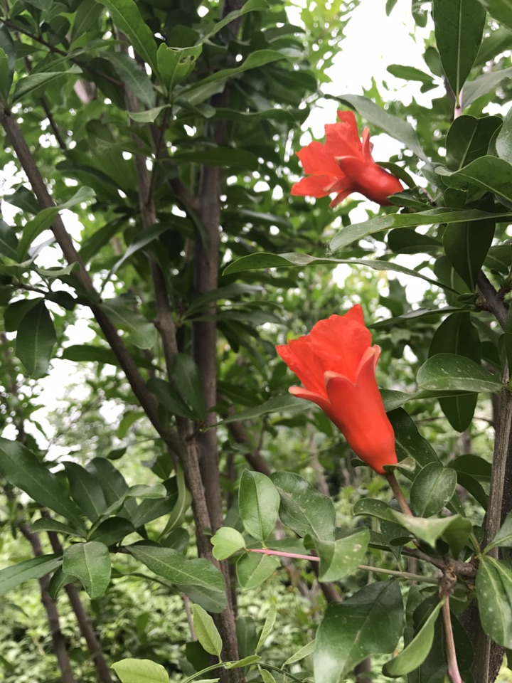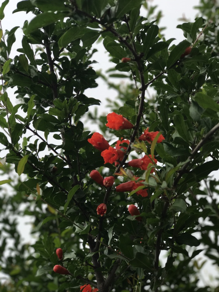 犹记得中秋前后是吃石榴的季节,倒是忘了几月是它的花期。在北方很多的果树花期都是推迟,想来石榴也不例外。老远便看到在翠绿的繁枝密叶中,几个红色的小铃铛煞是吸引人的眼球,走近一看,噢!原来是石榴开花了!自古人们便视石榴为吉祥物,视它为多子多福的象征,在老北京更是四合院的标配植物之一!