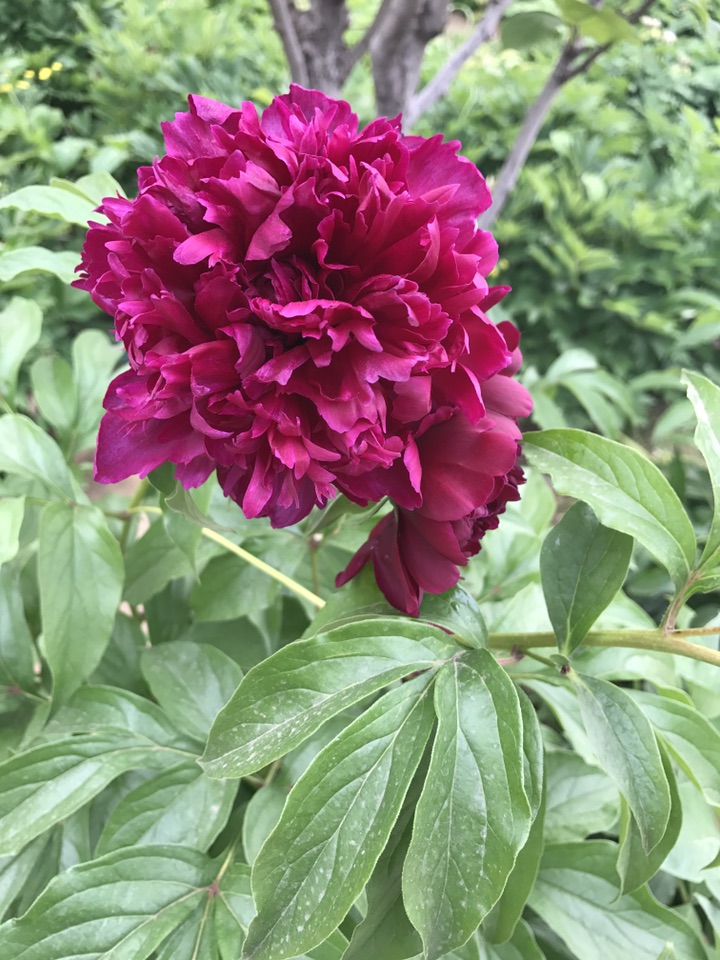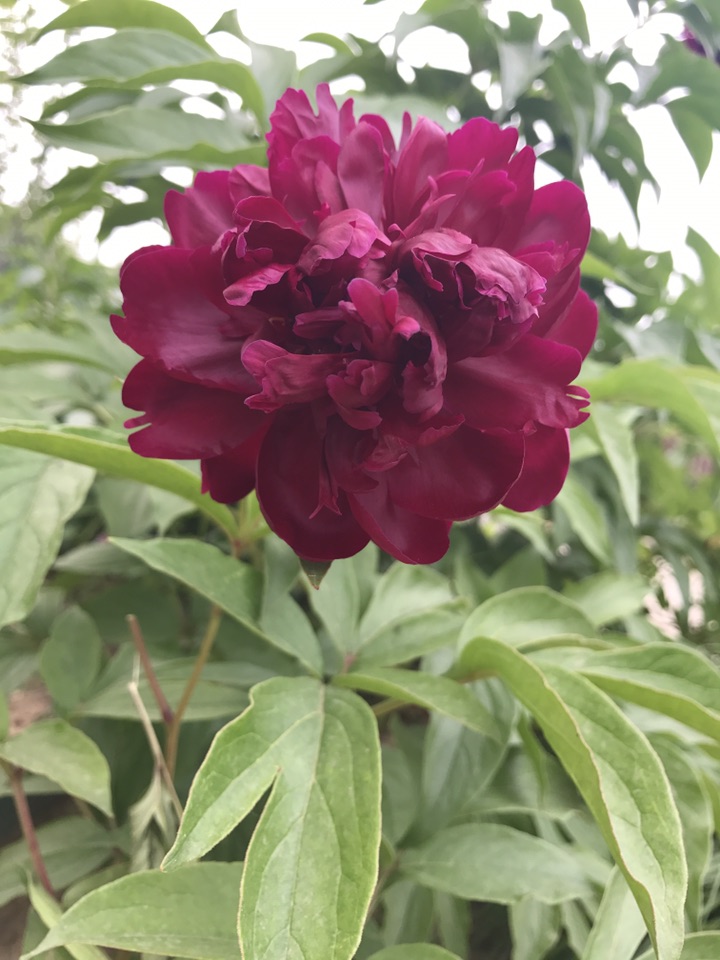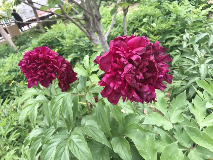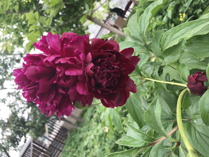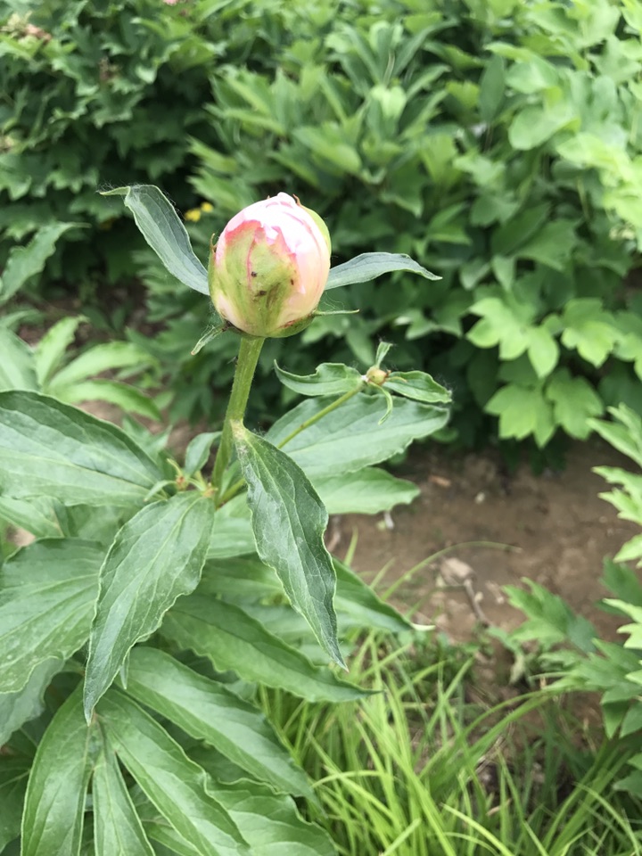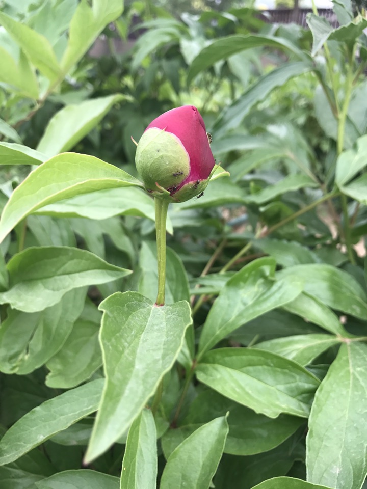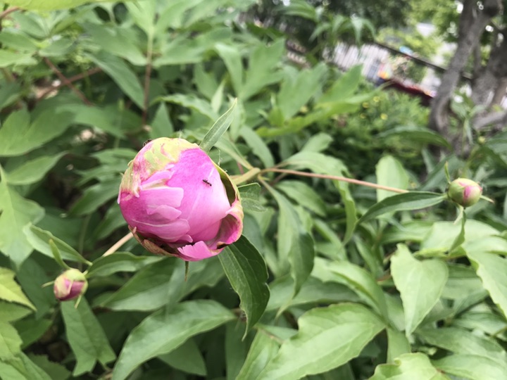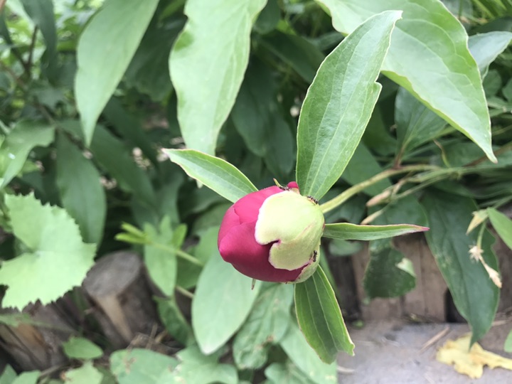 这是打碗花头上的几株芍药,花色紫红,除却盛开的零星几朵,多已凋零结果。未开的几个花骨朵上,不知为何每一朵上面都爬了好些蚂蚁,赶都赶不走,不知道的还以为这是刚从蜜罐子里捞出来的呢