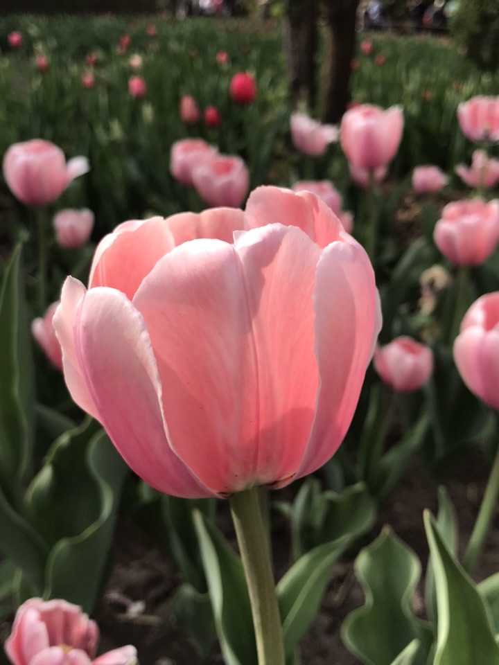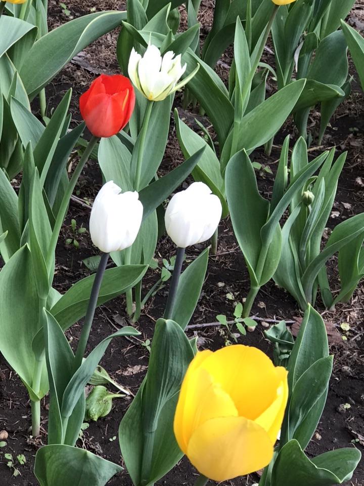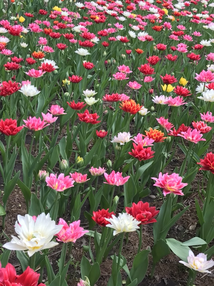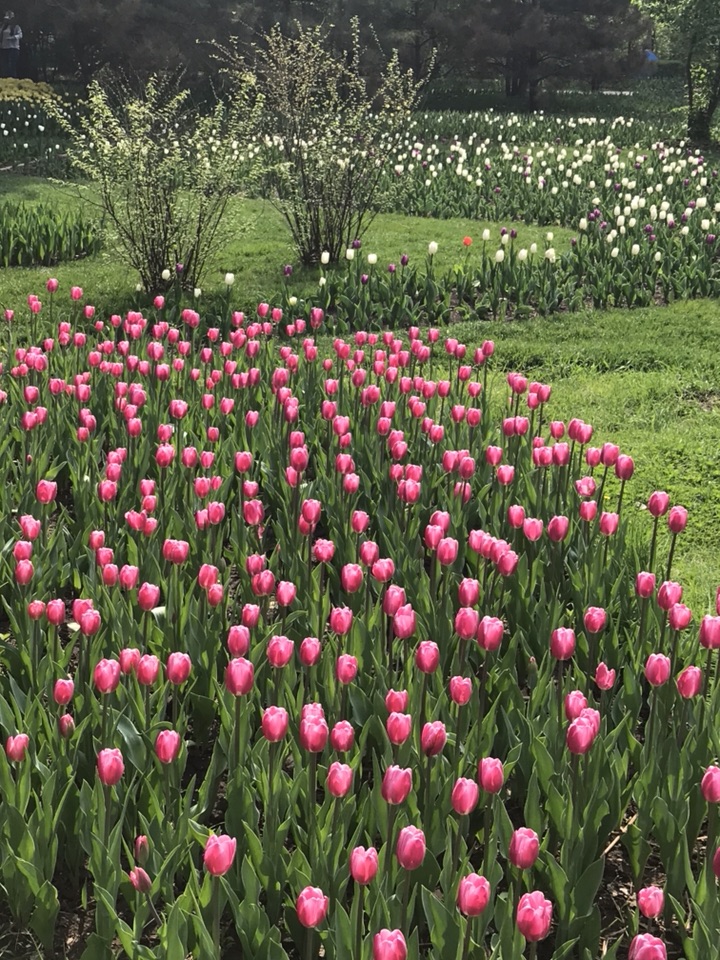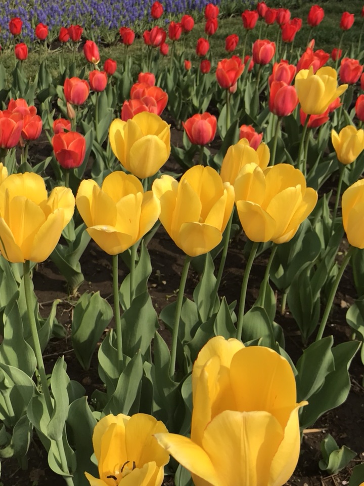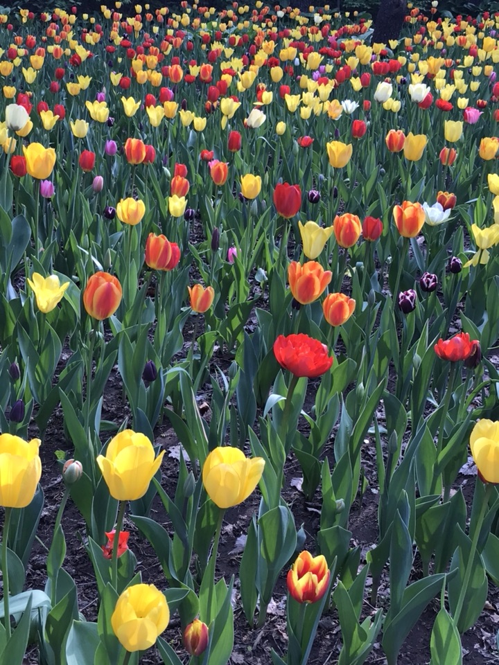 金黄、淡紫、浅粉与洁白,各色的郁金香争奇斗艳