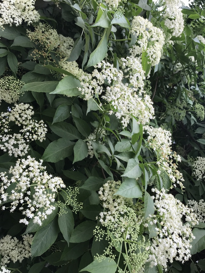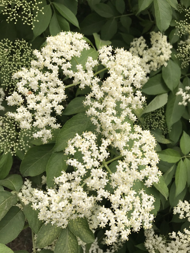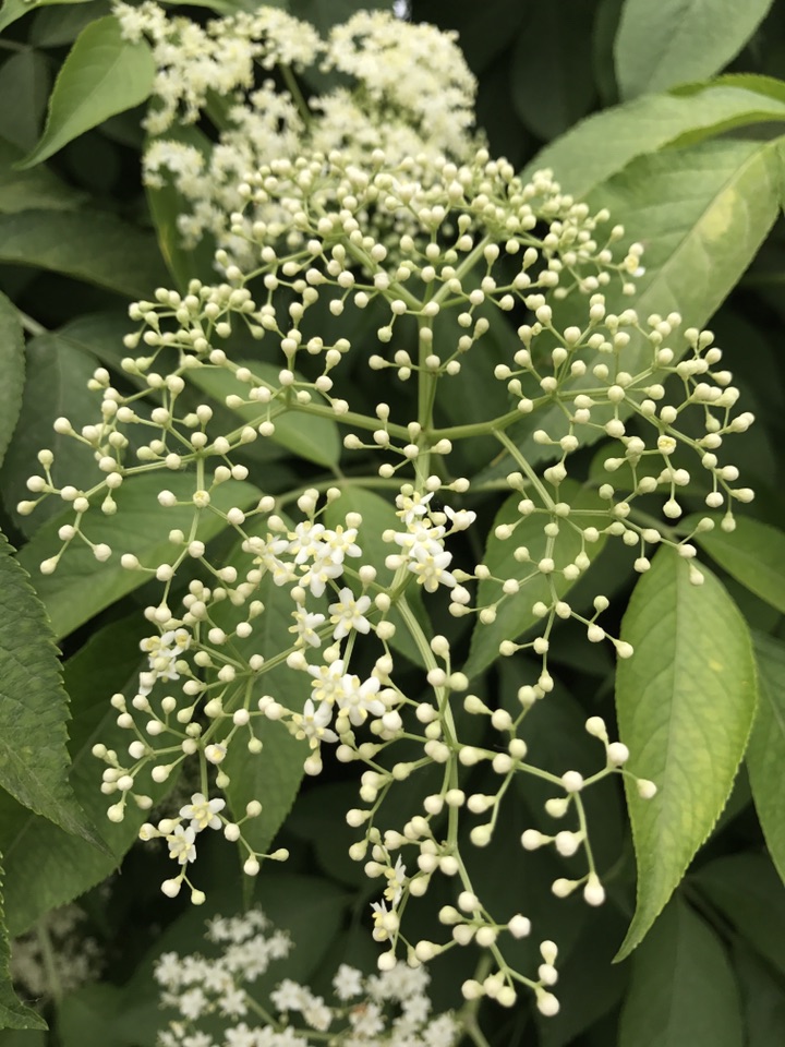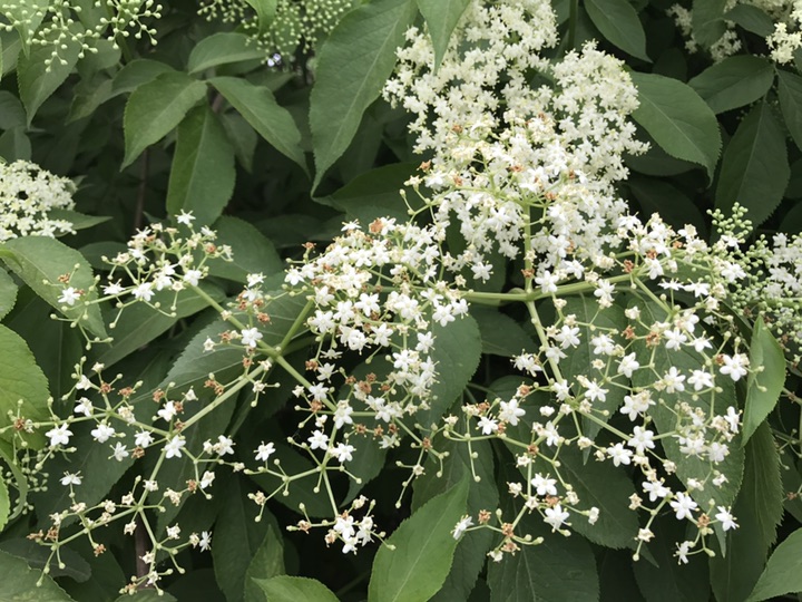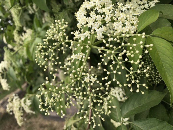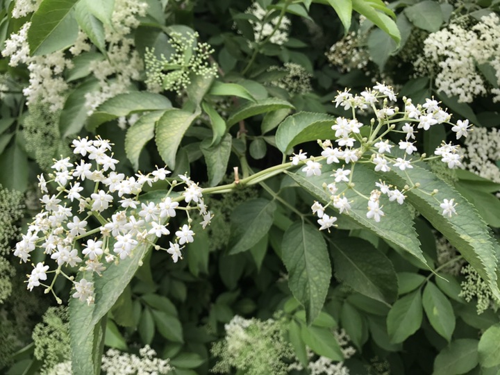 西洋接骨木为忍冬科接骨木属落叶乔木或大灌木,花期4-5月,果熟期7-8月。原产欧洲。据资料介绍接骨木从根到果实都有良好的药效如促进发汗、抗炎症、利尿,改善花粉症、治疗风湿、活血接骨、消肿痛风等等,所以有“万能药箱”之称,是人们广泛使用的民间药方,其中尤以花和果实的药效特别多。