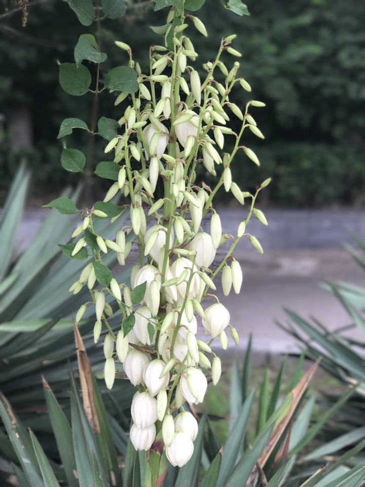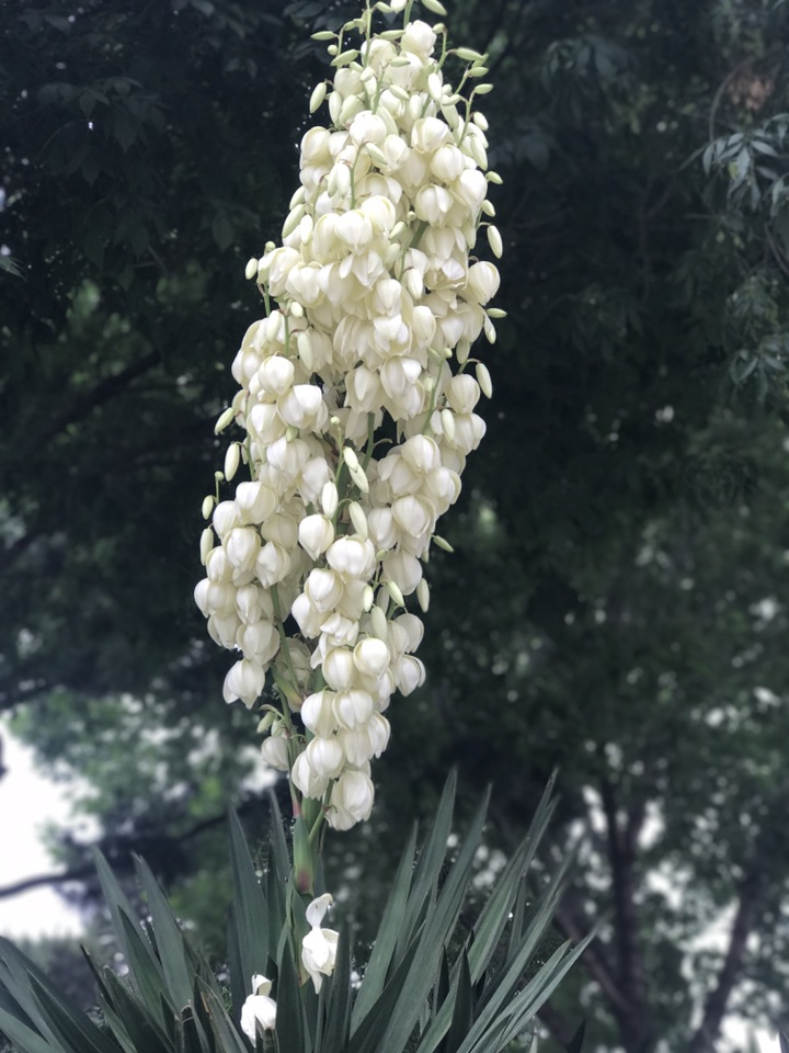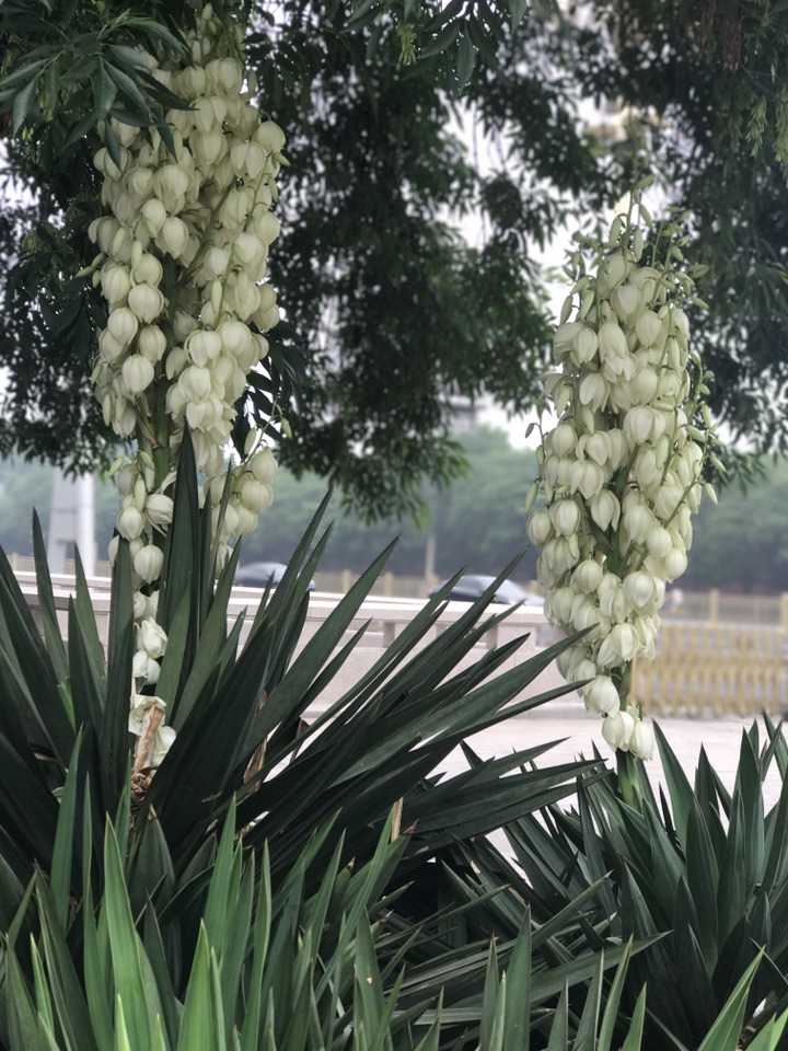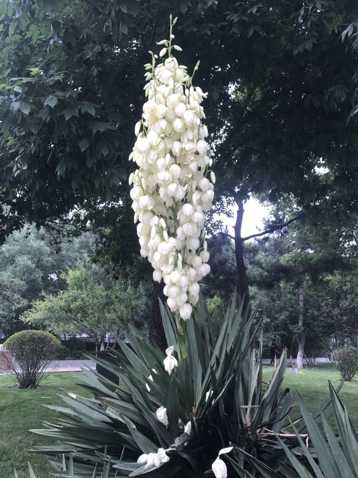 昨儿个出去恰巧看到丝兰花开的正美,记得它的花期不是在国庆前后吗?这么早就开始了吗?一查原来夏、秋两季均为它的开花期。凤尾丝兰又称菠萝花 ,龙舌兰科常绿木本植物,具短茎并常有分枝。 植株呈莲座状,大型的圆锥花序着生多数似钟形而下垂的洁白花朵,给人以素雅而脱俗之感。既可观花,又可赏叶。