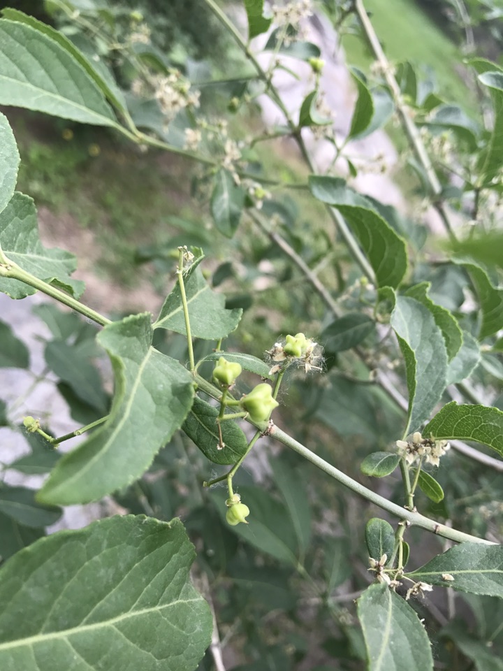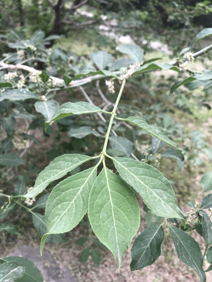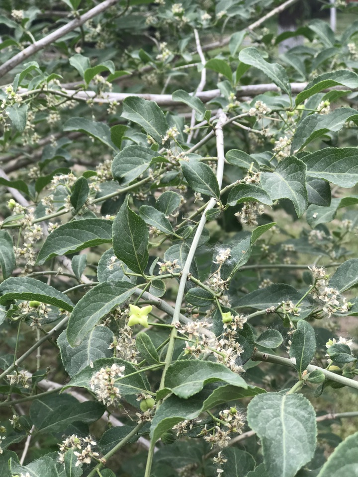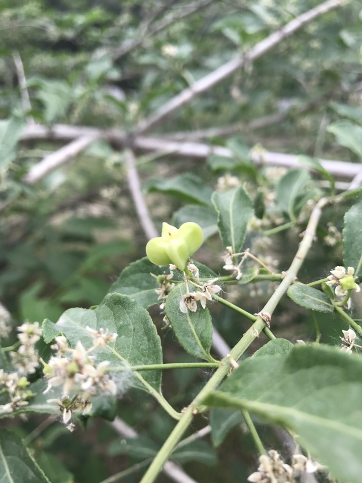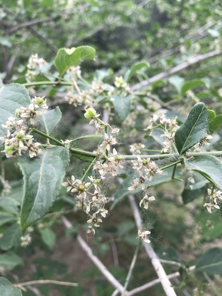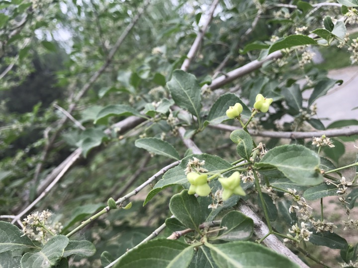 一开始并没有认出来它跟前面的那篇是同一种植物。这里的叶子粗糙且厚实,不像丝绵木般柔美轻盈,不光叶子差距太大,一个以树的形态立在你面前,一个却是以灌木的形象出现在你眼帘。着实不敢认!可你看它的叶子分布结构,它的花,它的果却又分明是丝绵木错不了。