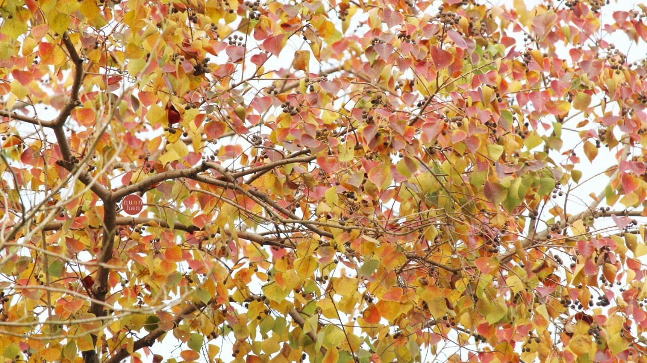 深秋时,叶落籽出,露出白色的籽实,好似一串串“珍珠”。不管是晴天、阴天还是雨天,白头翁、山雀、八哥等鸟儿,都喜欢在这几棵乌桕树上停歇、歌唱、食乌桕籽。
