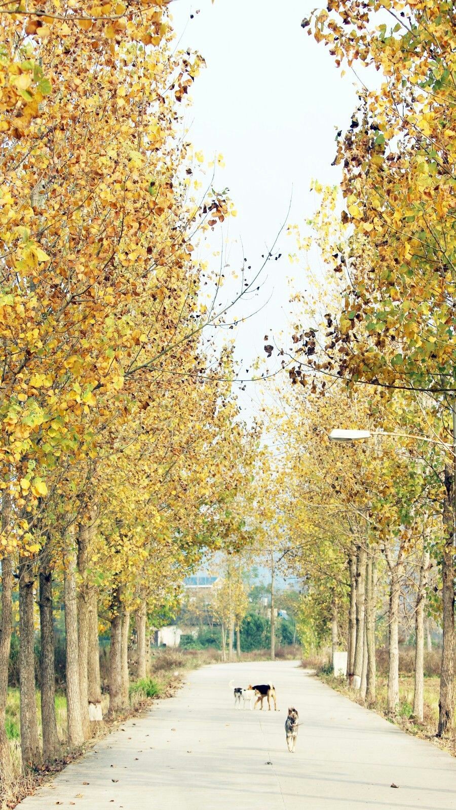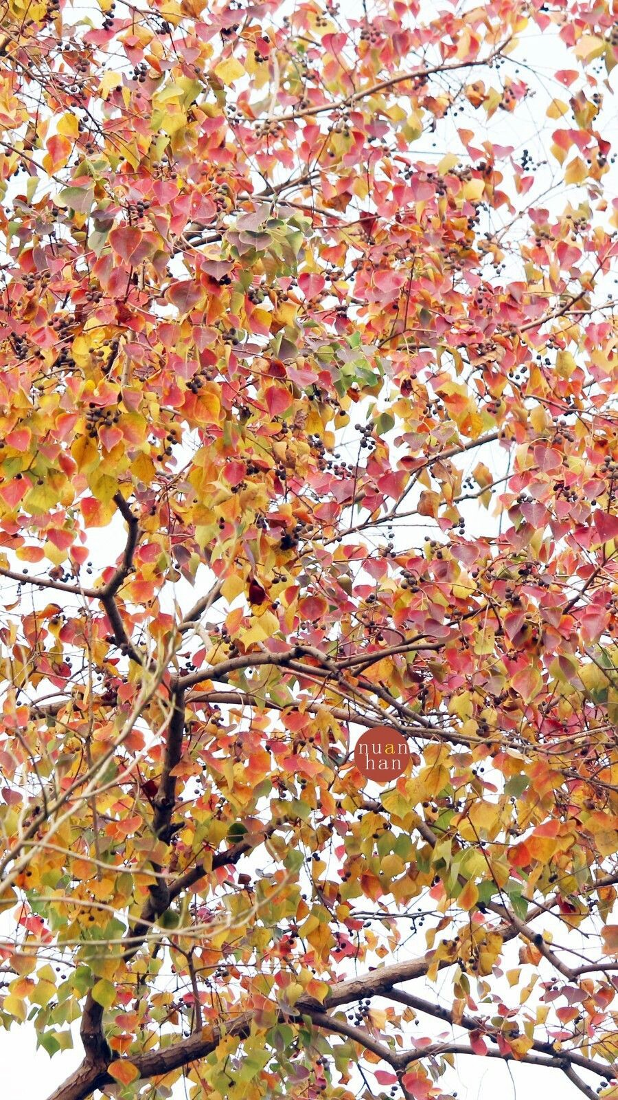 在家的这段时间,每天都会路过河边的马路,看着岸边的乌桕树(木子树)由绿变黄、变红,黄(红)绿相间,色彩斑斓艳丽,极其美丽。