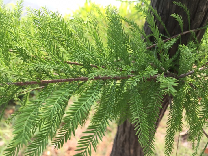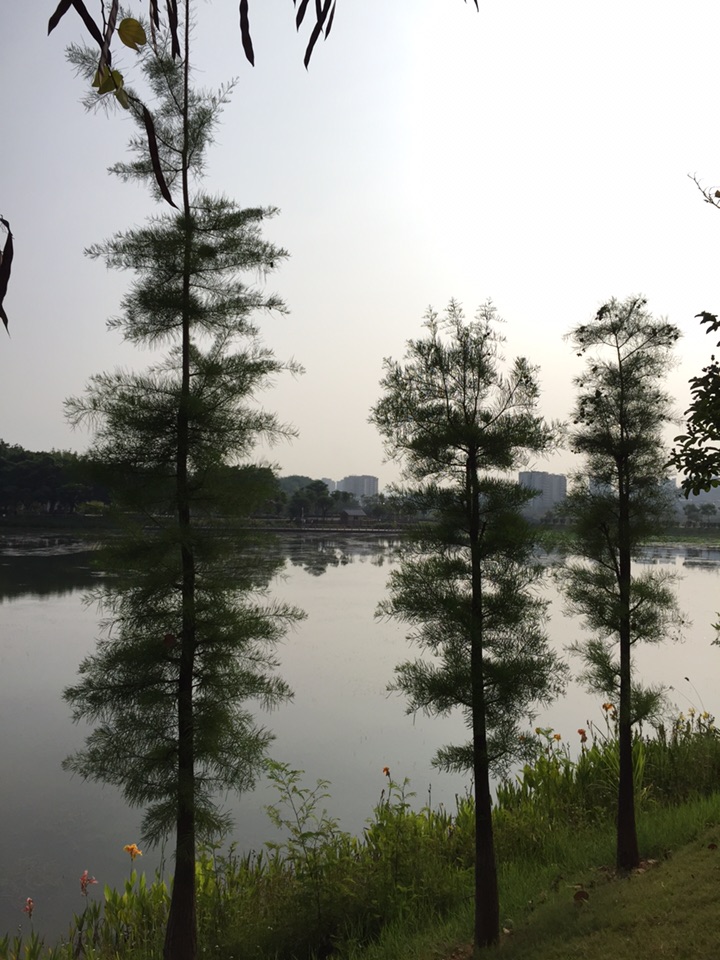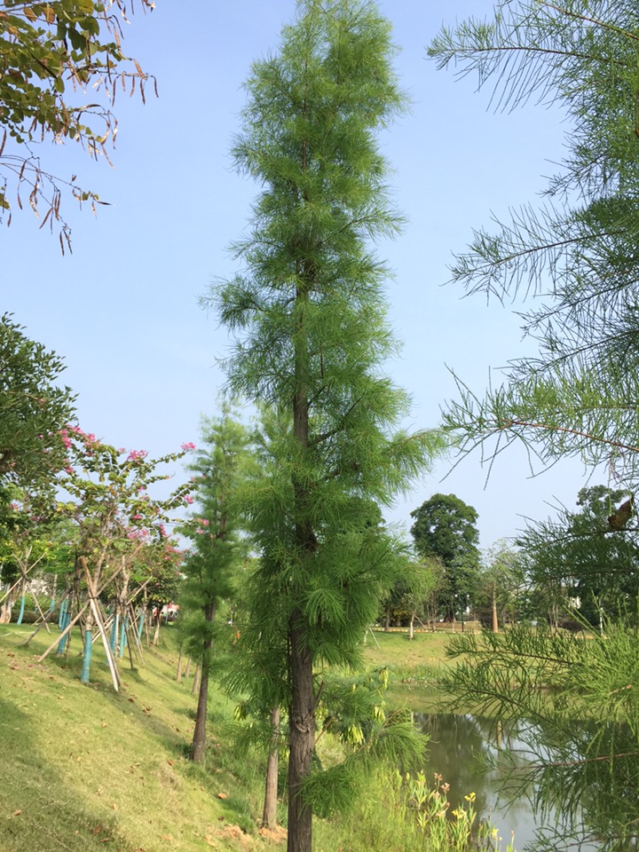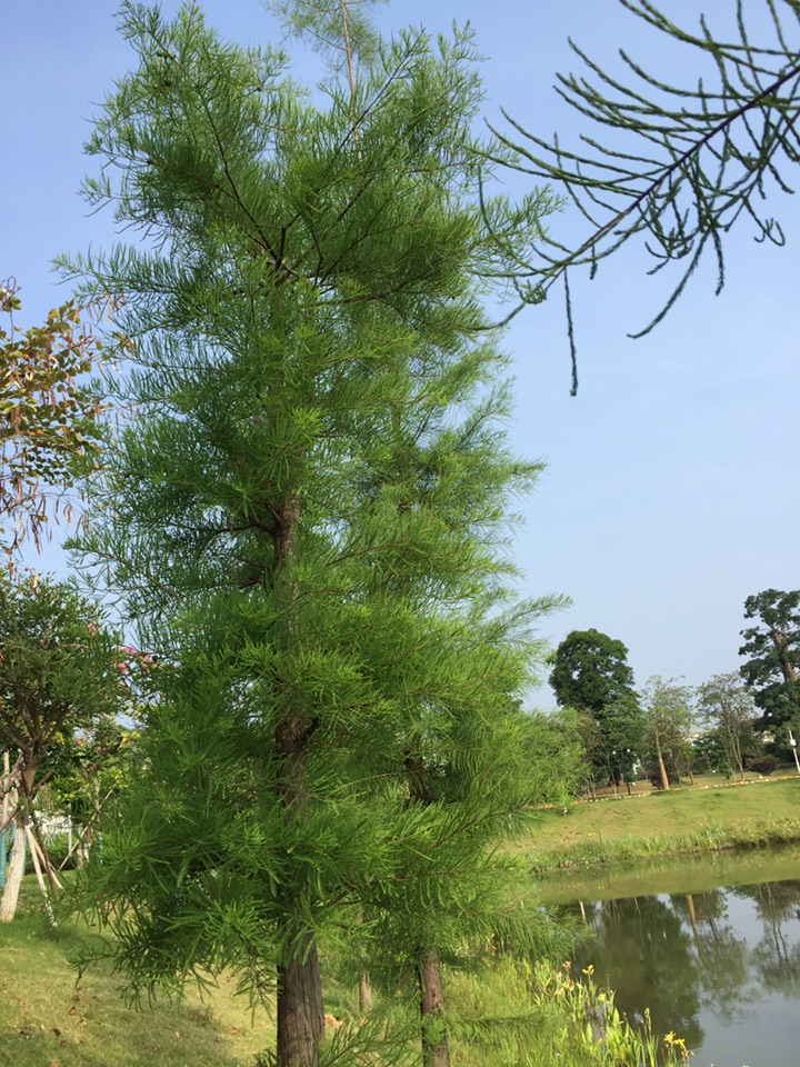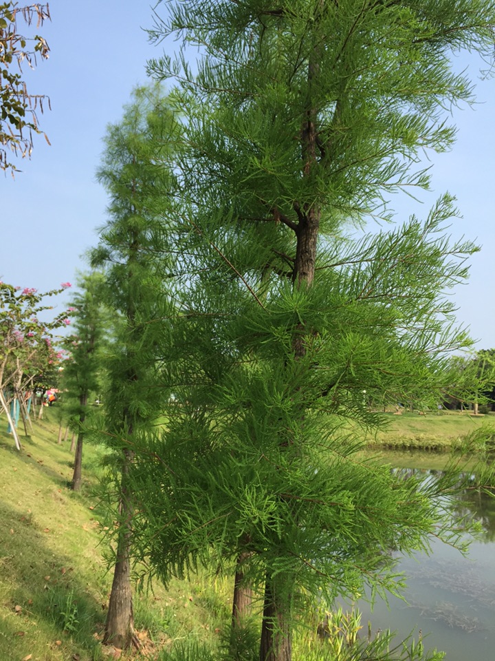 公园的湖边去年栽种了一排池杉,现在已长出了茂盛的叶子。