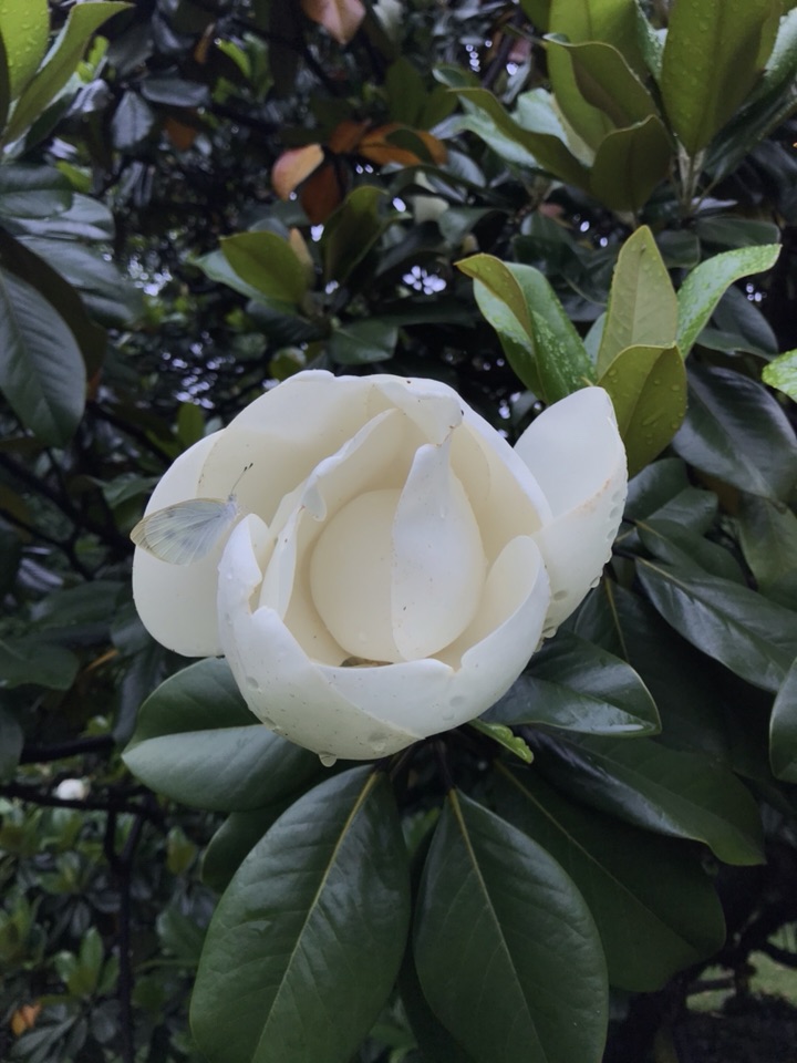 在拍玉兰花时,偶然发现一只相同颜色的蝴蝶,几乎与花融为一体。
