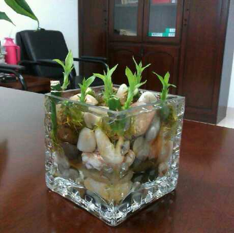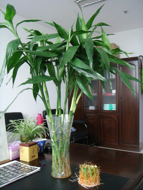 喜欢在办公室养富贵竹,既美化环境又便于打理,十几块钱一大把可以养上好几年。听花鸟市场的老板娘说,往花瓶里放几根生锈的铁钉有助于富贵竹生根,并且叶子也会变得翠绿壮实,试了下,这招确实有用。插在水里半个月后,根须就长出来了,生机勃勃的样子蛮招人喜欢的。