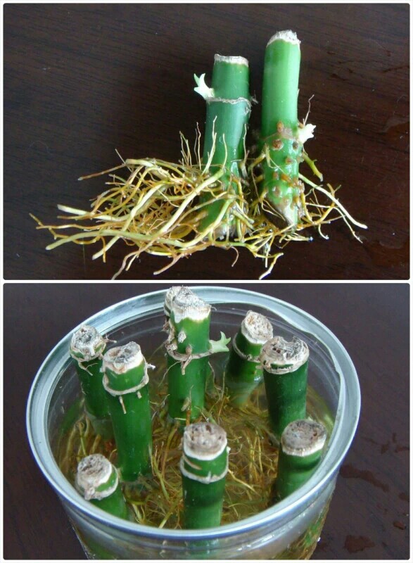 但那截离开了叶子的根,我是真舍不得丢弃,想想还是找了个塑料罐子装了起来,并注上水。没想过它会活下来,更没想过它能发芽,可是一个月后,缺了叶子的富贵竹根竟然真的抽出了新芽,那细细嫩嫩的感觉,就像刚出生的婴儿般惹人爱怜。