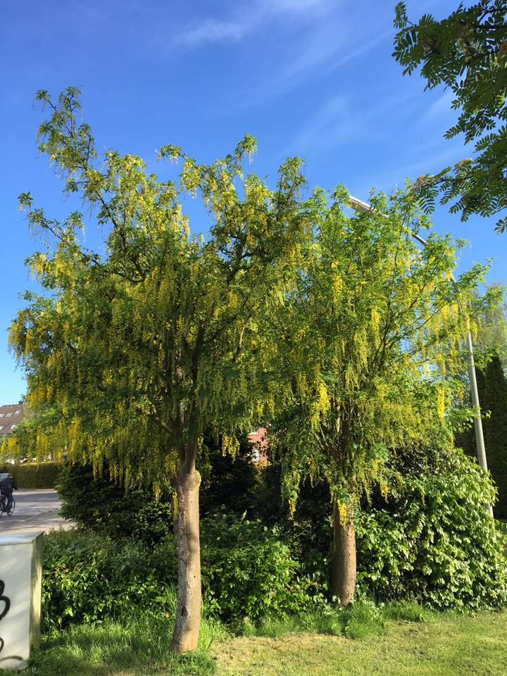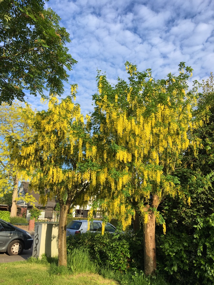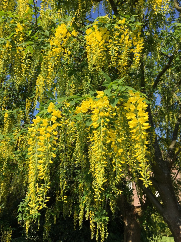 去年五月在外出差期间,拍到黄色瀑布般美树两棵,其花隐隐跟槐花、紫藤相仿,虽天天思念但不得其名。