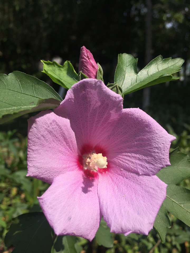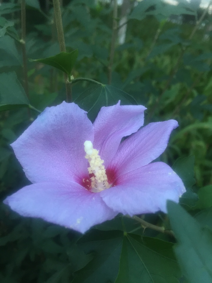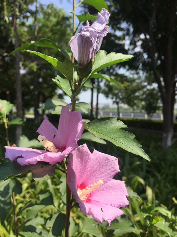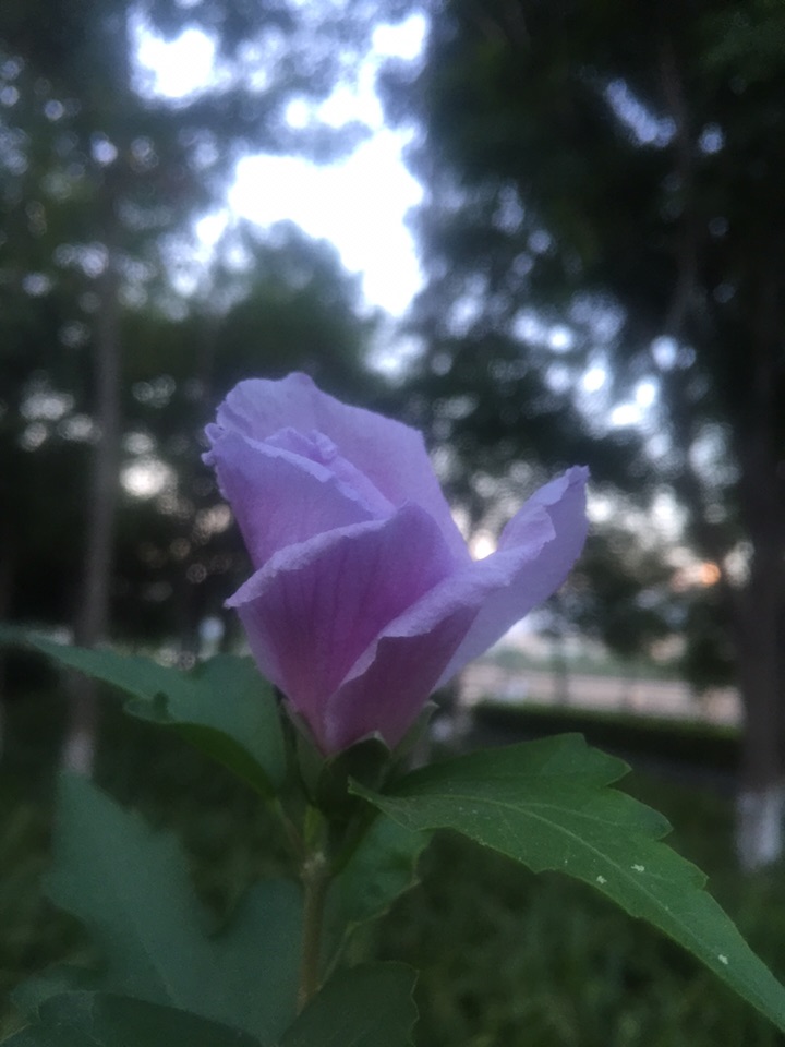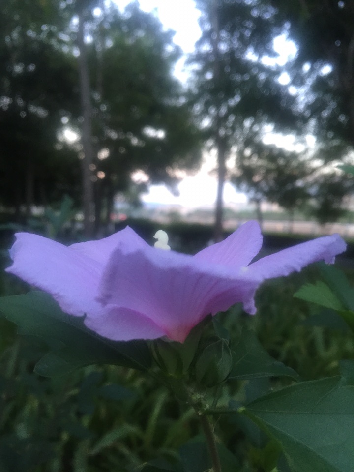 木槿花儿次第开放了。今天看到的是紫色单瓣的木槿,在夏日的黄昏里,开的纷芳妩媚,在花前,终而有了一丝清凉。