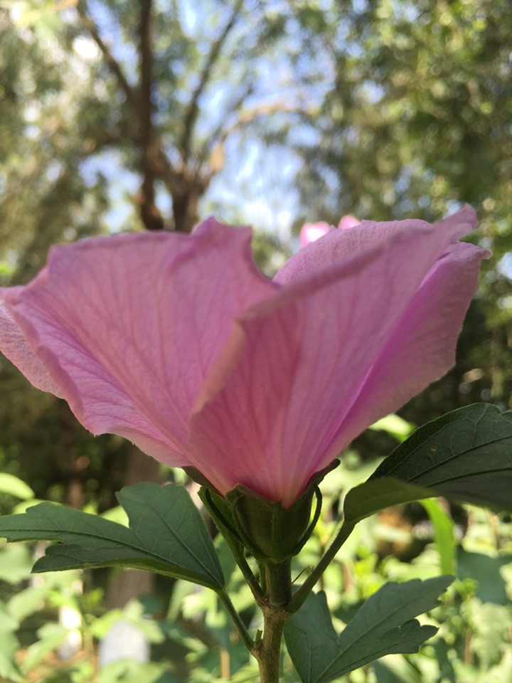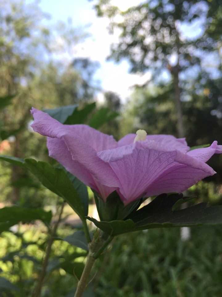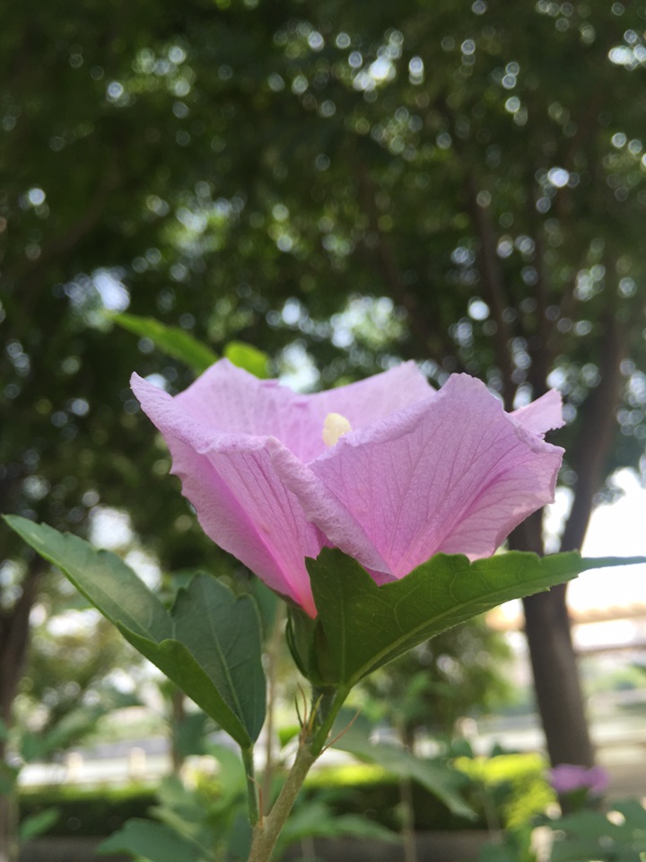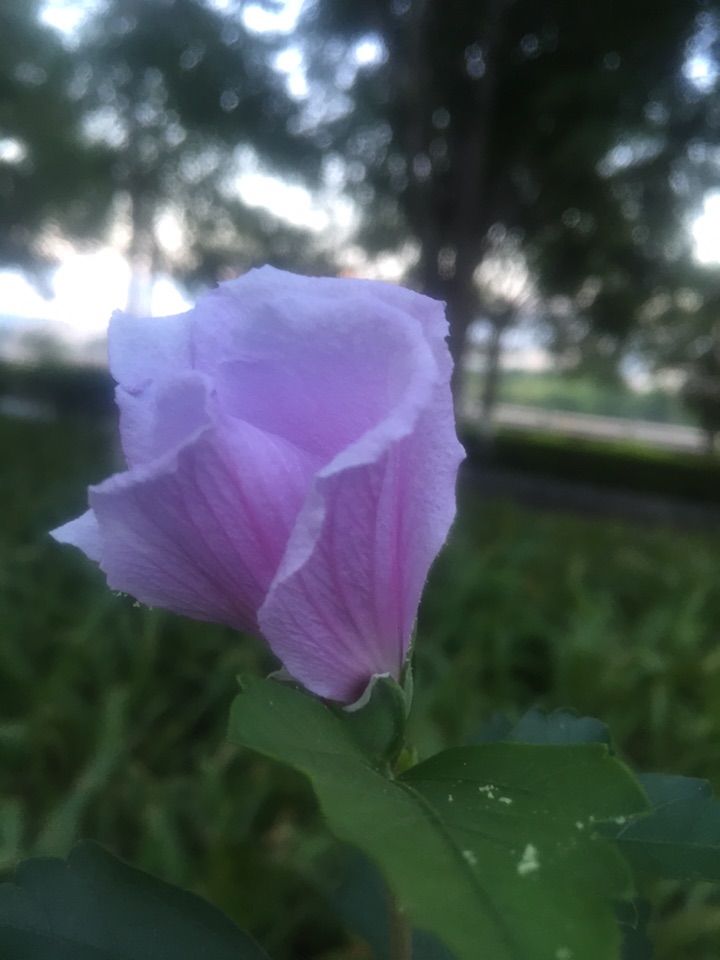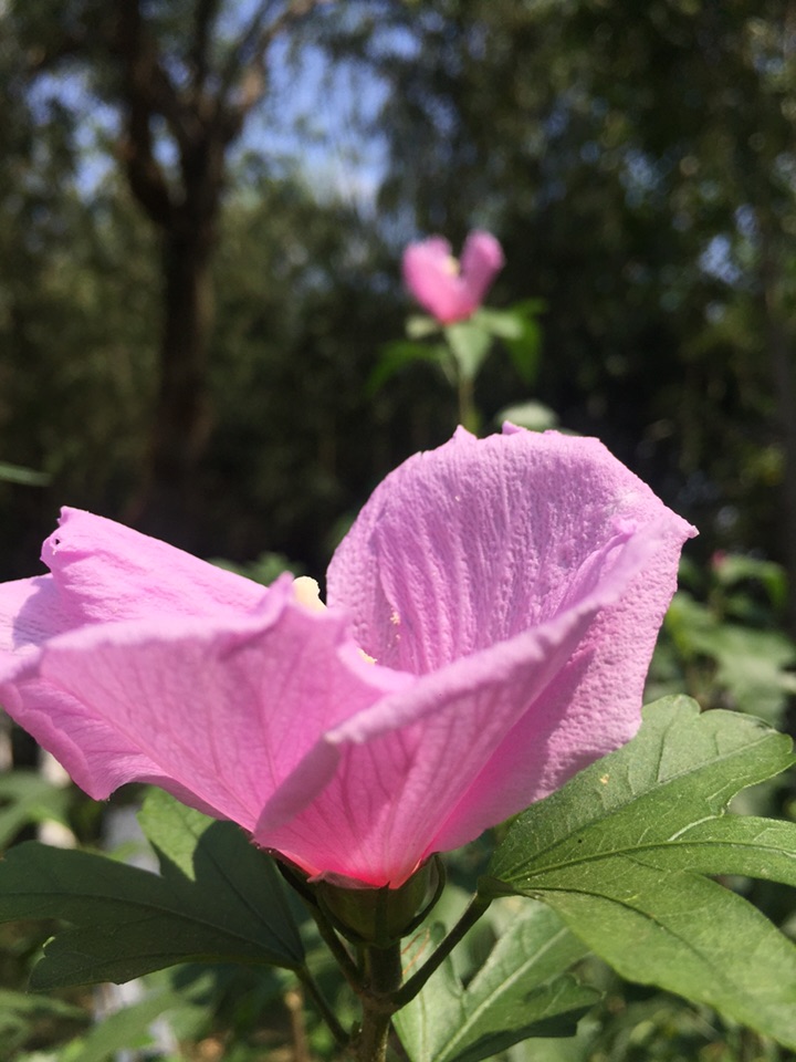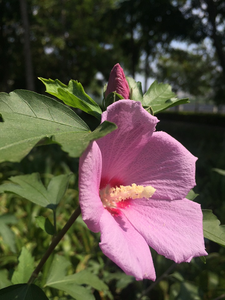 木槿花儿次第开放了。今天看到的是紫色单瓣的木槿,在夏日的黄昏里,开的纷芳妩媚,在花前,终而有了一丝清凉。