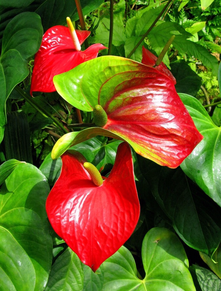 花烛,别名火鹤花、红鹤芋,属植物的叶子和枝茎外形奇特:其叶颜色深绿,心形,厚实坚韧,花蕊长而尖,有鲜红色、白色或者绿色,周围是红色、粉色或魄的佛焰苞,它们全都有毒。此花又名弗拉门戈花或猪尾巴草,一旦误食,嘴里会感觉又烧又痛,随后使会肿胀起泡,嗓音变得嘶哑紧张,并且吞咽困难。