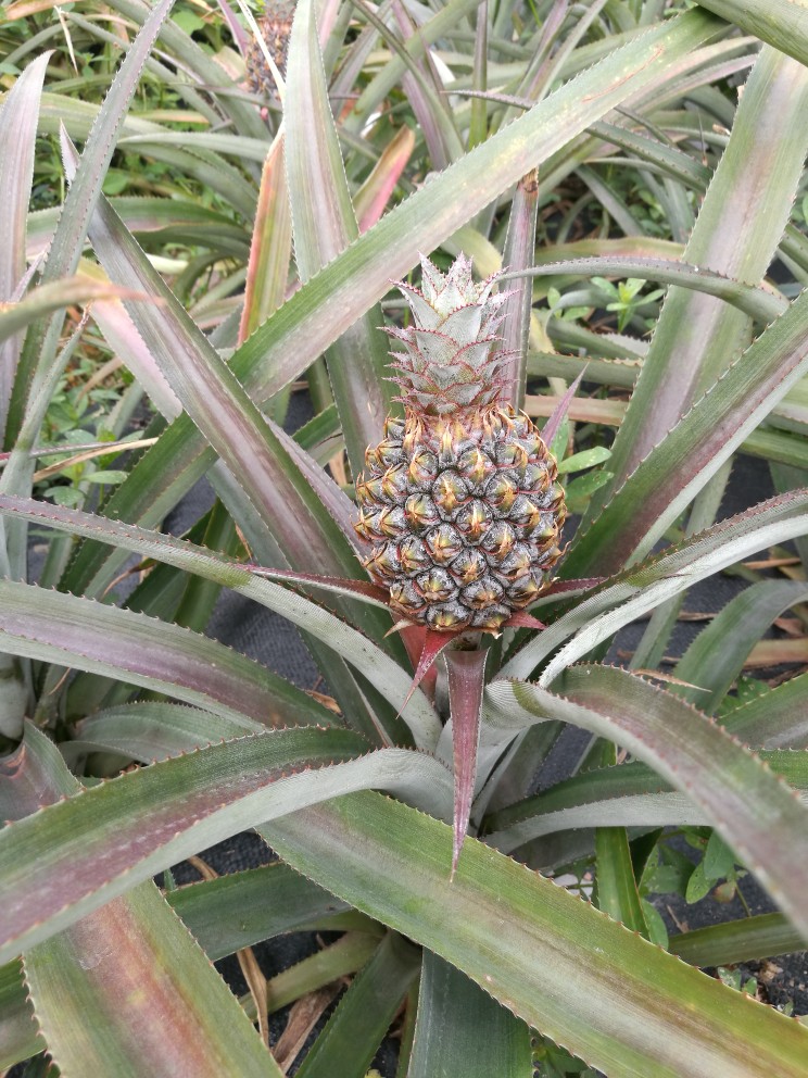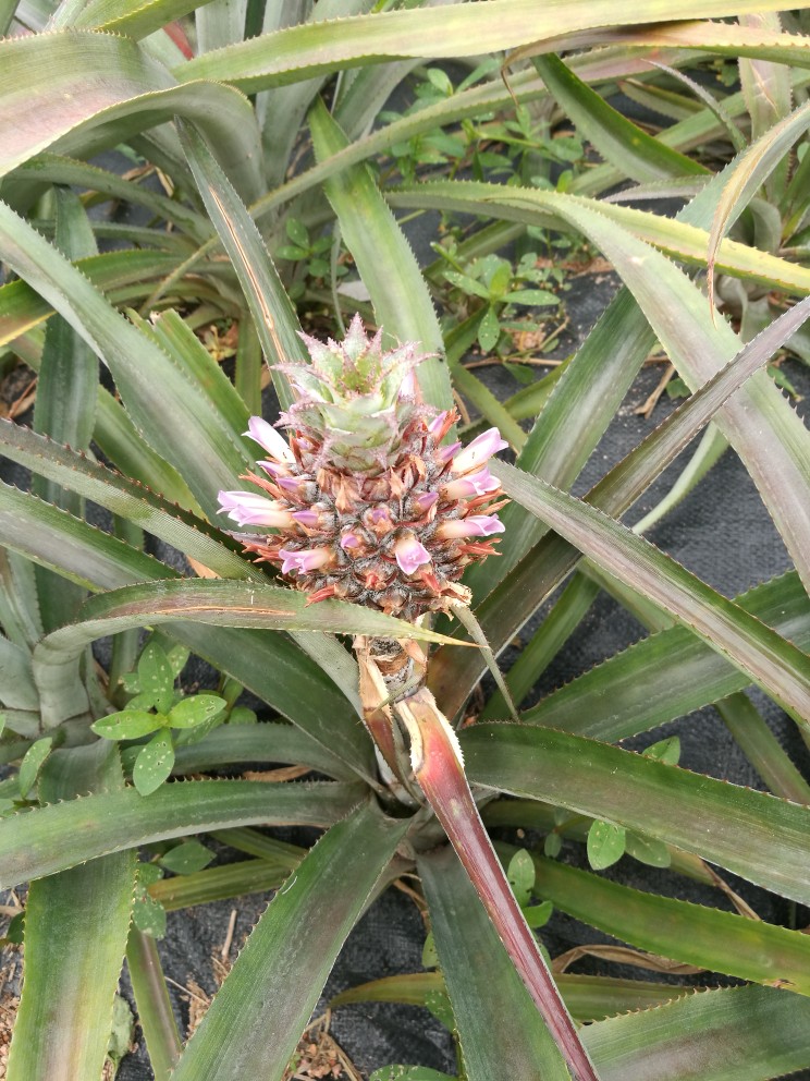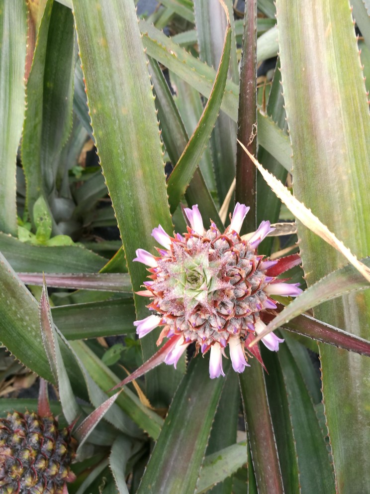 菠萝又叫凤梨,一直以为菠萝像无花果一样,不会开花,直到今天去果园仔细观察才发现菠萝也会开花!