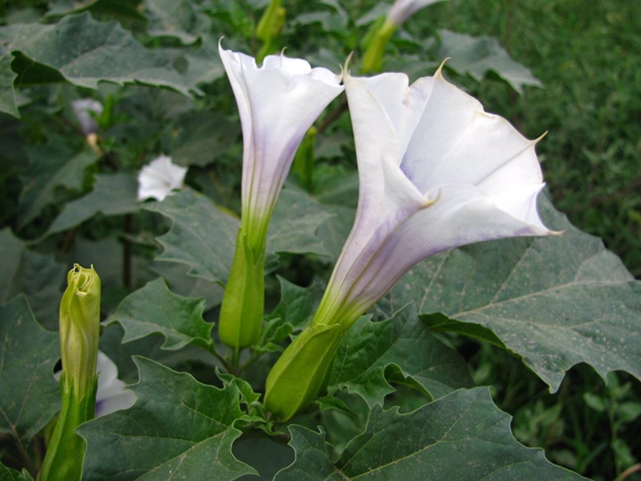 又叫曼荼罗、满达、曼扎、曼达、醉心花、狗核桃、洋金花、枫茄花、万桃花、闹羊花、大喇叭花、山茄子。草本或半灌木状,高0.5~1.5米,全体近于平滑或在幼嫩部分被短柔毛。茎粗壮,圆柱状,淡绿色或带紫色,下部木质化。叶广卵形。花单生于枝叉间或叶腋,直立,有短梗;花萼筒状。
