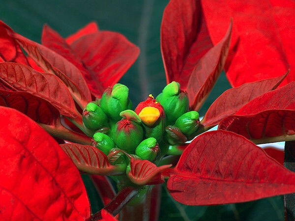 灌木。根圆柱状,极多分枝。茎直立,高1-3,直径1-4 厘米,无毛。叶互生,卵状椭圆形、长椭圆形或披针形,绿色,边缘全缘或浅裂或波状浅裂,叶面被短柔毛或无毛,叶背被柔毛;苞叶5-7枚,狭椭圆形,长3-7厘米,宽1-2厘米,通常全缘,极少边缘浅波状分裂,朱红色。
