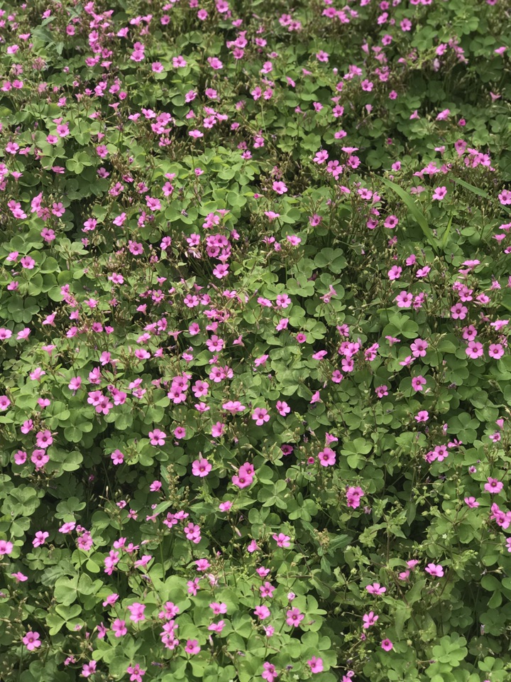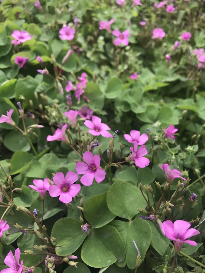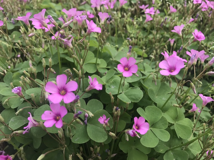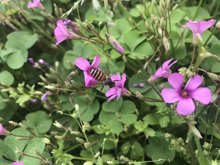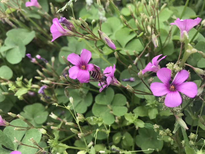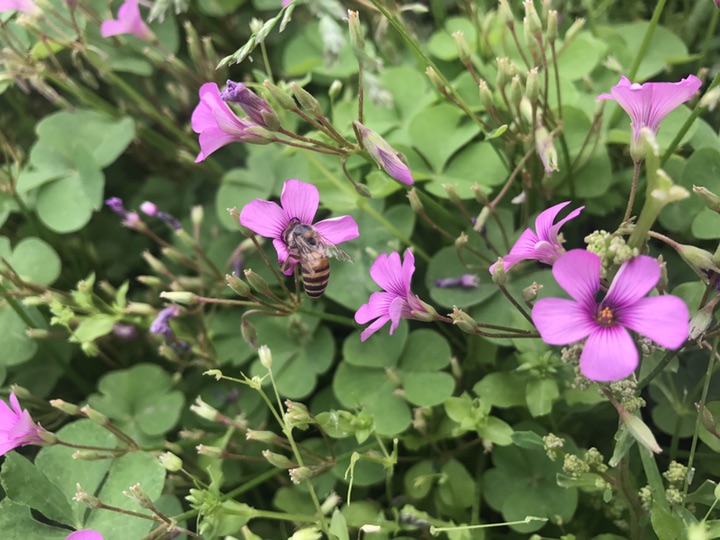 想起很长时间没有去万寿公园转转了,趁着今儿天气不是很热特意去那边走了走。比起上次去时的其貌不扬,这次的她倒显得绚烂多姿起来。各色花儿赶着开放,才一进门便是一大片的粉色小花儿静默开放,赶忙凑近了一瞧,呦!这不是关节酢浆草嘛,居然长这么一大片,不起眼的小花儿这么一成规模起来,倒是很抢眼呢!更有勤劳的蜜蜂过来捧场,这朵闻闻那朵嗅嗅,不时还直往花心里钻,笨重的身躯把柔弱的花茎直往下压,看得人甚是担心会不会直接把花给折了