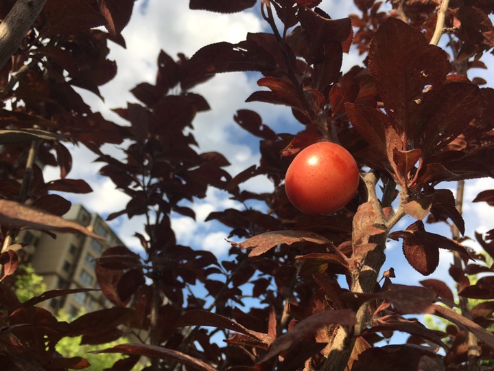 附近绿化带里有很多紫叶李,今天偶然发现一棵上有一个果子,在阳光下晶莹剔透。仔细的找了半天,别的树上都没有。
