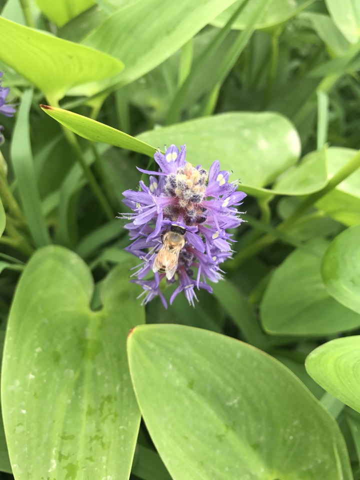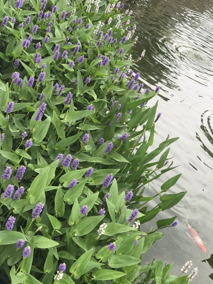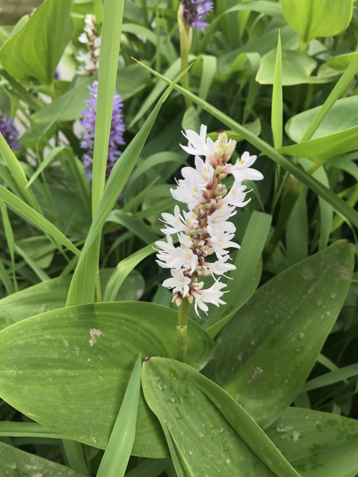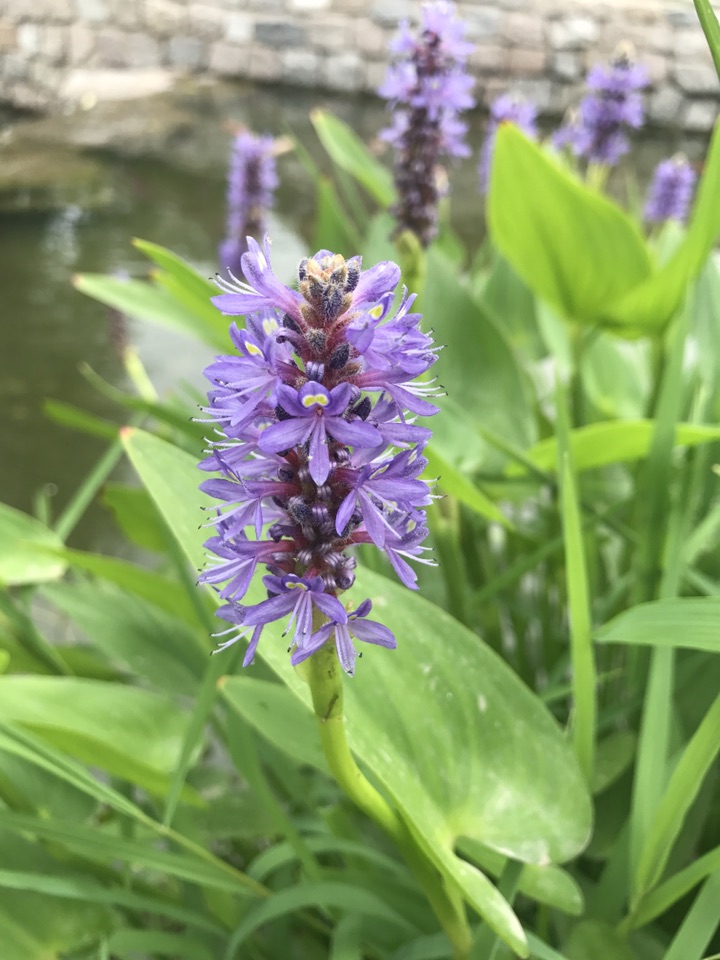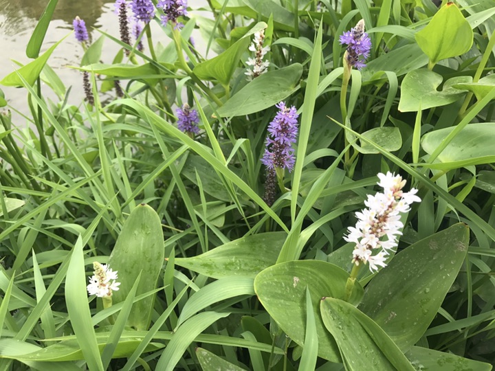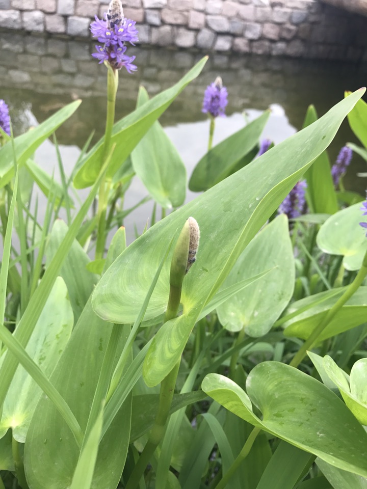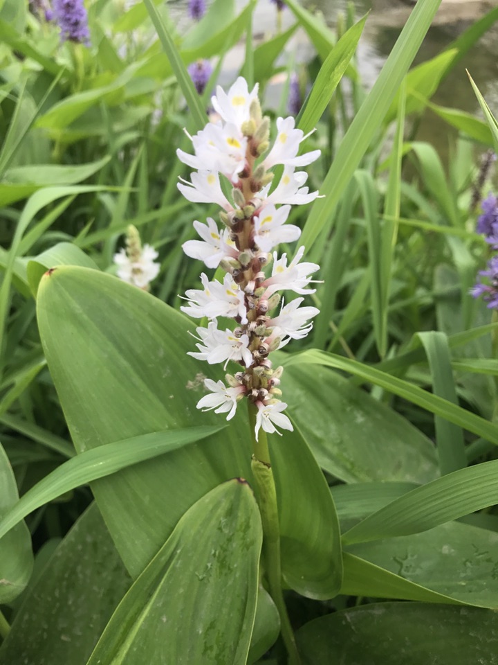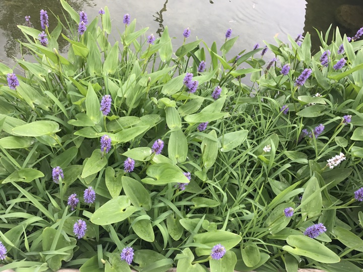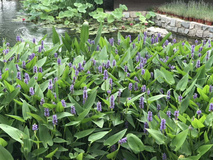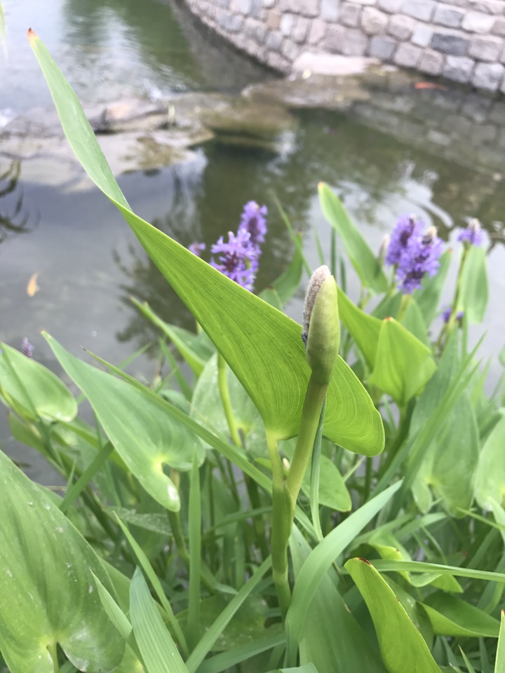 梭鱼草(学名:Pontederia cordata L.)是雨久花科,梭鱼草属多年生挺水或湿生草本植物, 花葶直立,通常高出叶面,穗状花序顶生,每条穗上密密的簇拥着几十至上百朵蓝紫色圆形小花,上方两花瓣各有两个黄绿色斑点,质地半透明。