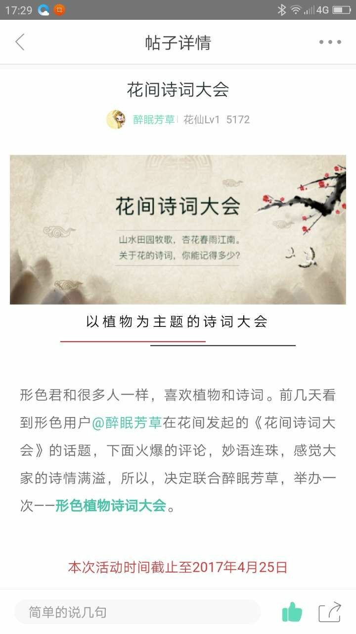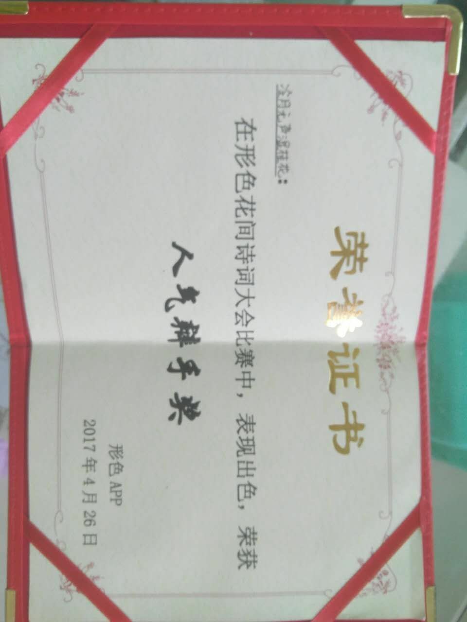 今天升级可以发帖了,就发前段时间参加形色花间诗词大会的得奖纪念吧,可别说我爱显摆哦(⊙o⊙)😉